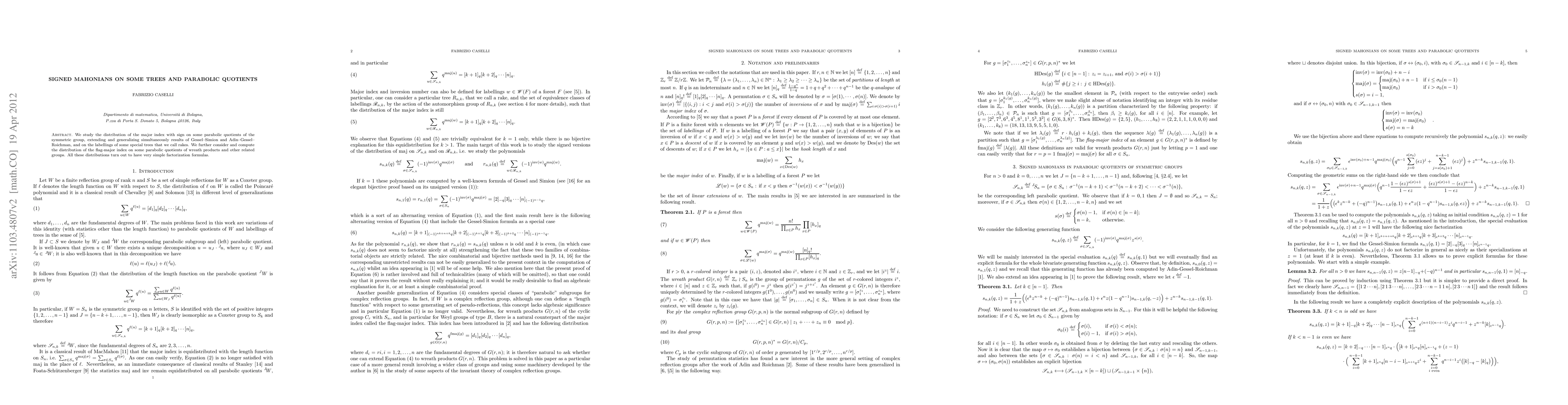 This paper explores the distribution of the signed major index on parabolic quotients of the symmetric group and on special trees termed rakes, extending previous results. It also investigates the flag-major index on parabolic quotients of wreath products, revealing simple factorization formulas for all distributions.