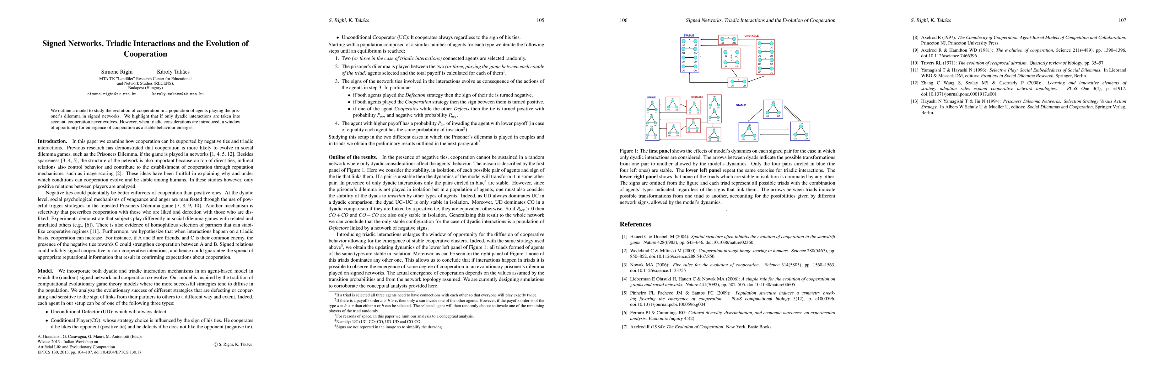We outline a model to study the evolution of cooperation in a population of agents playing the prisoner's dilemma in signed networks. We highlight that if only dyadic interactions are taken into account, cooperation never evolves. However, when triadic considerations are introduced, a window of opportunity for emergence of cooperation as a stable behaviour emerges.