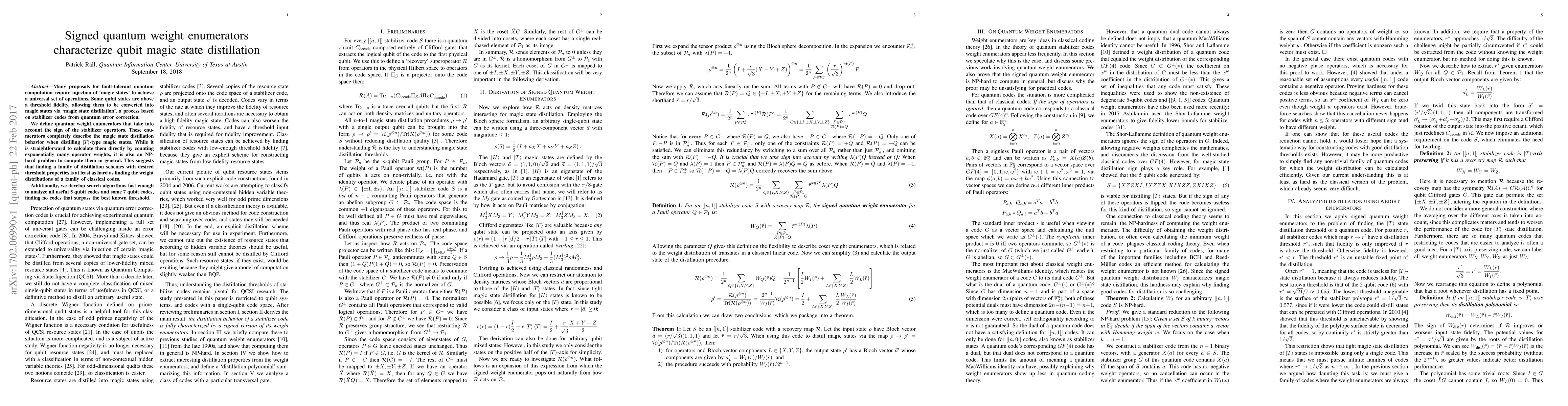 This paper introduces signed quantum weight enumerators to characterize the behavior of qubit magic state distillation, essential for fault-tolerant quantum computation. It concludes that while enumerating these weights is NP-hard, developed search algorithms can analyze smaller codes without finding any that exceed current best thresholds.