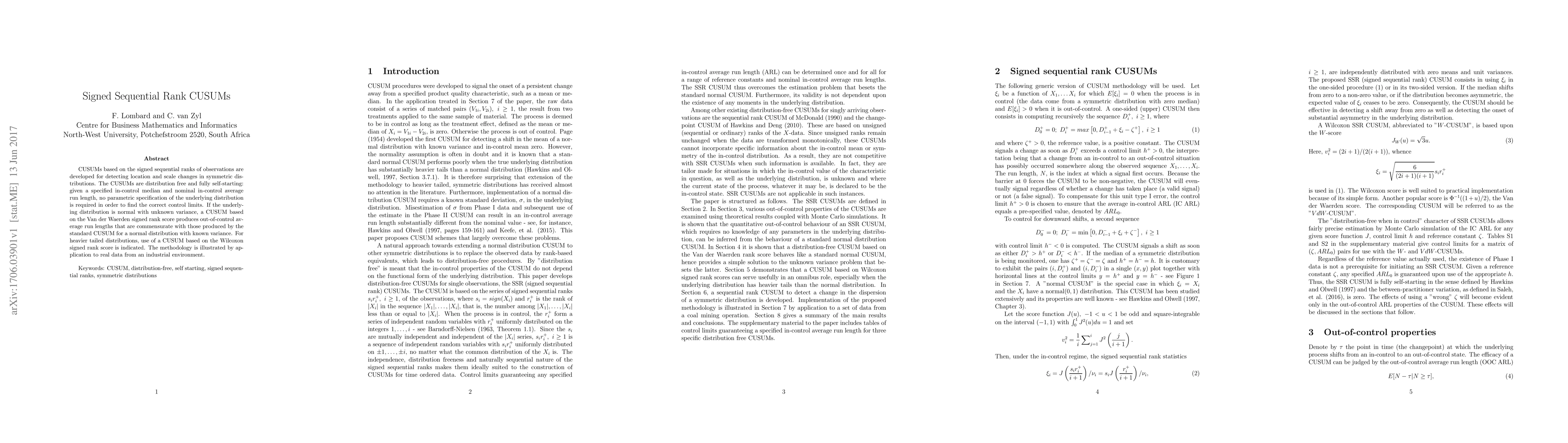 CUSUMs based on the signed sequential ranks of observations are developed for detecting location and scale changes in symmetric distributions. The CUSUMs are distribution free and fully self-starting: given a specified in-control median and nominal in-control average run length, no parametric specification of the underlying distribution is required in order to find the correct control limits. If the underlying distribution is normal with unknown variance, a CUSUM based on the Van der Waerden signed rank score produces out-of-control average run lengths that are commensurate with those produced by the standard CUSUM for a normal distribution with known variance. For heavier tailed distributions, use of a CUSUM based on the Wilcoxon signed rank score is indicated. The methodology is illustrated by application to real data from an industrial environment.