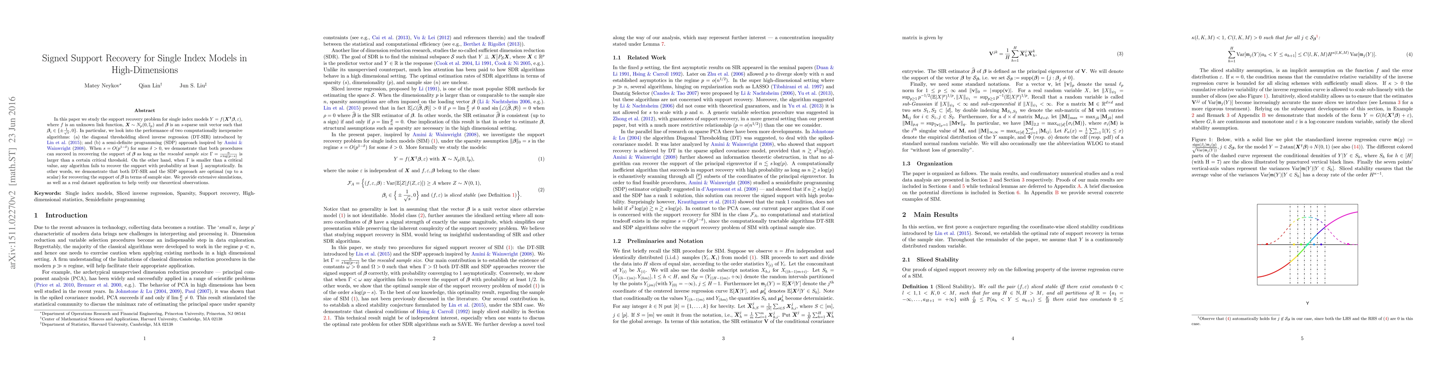 This research establishes that two computationally efficient algorithms, Diagonal Thresholding Sliced Inverse Regression (DT-SIR) and Semi-Definite Programming (SDP), optimally recover the support of a sparse vector beta in high-dimensional single index models under specific sample size conditions. The study demonstrates these methods' effectiveness via theoretical proofs, simulations, and a real-world dataset application.