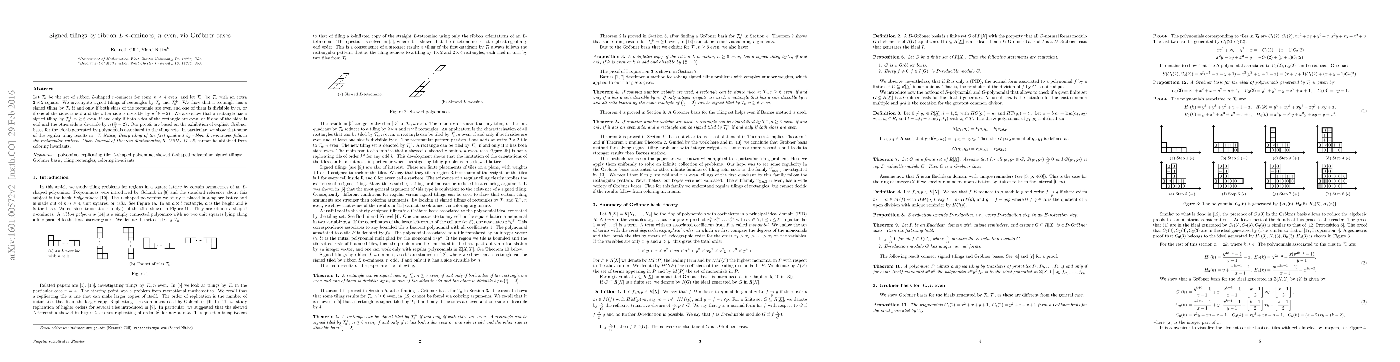 Let $\mathcal{T}_n$ be the set of ribbon $L$-shaped $n$-ominoes for some $n\ge 4$ even, and let $\mathcal{T}_n^+$ be $\mathcal{T}_n$ with an extra $2\times 2$ square. We investigate signed tilings of rectangles by $\mathcal{T}_n$ and $\mathcal{T}_n^+$. We show that a rectangle has a signed tiling by $\mathcal{T}_n$ if and only if both sides of the rectangle are even and one of them is divisible by $n$, or if one of the sides is odd and the other side is divisible by $n\left (\frac{n}{2}-2\right ).$ We also show that a rectangle has a signed tiling by $\mathcal{T}_n^+, n\ge 6$ even, if and only if both sides of the rectangle are even, or if one of the sides is odd and the other side is divisible by $n\left (\frac{n}{2}-2\right ).$ Our proofs are based on the exhibition of explicit Gr\"obner bases for the ideals generated by polynomials associated to the tiling sets. In particular, we show that some of the regular tiling results in \emph{ V.~Nitica, Every tiling of the first quadrant by ribbon $L$ $n$-ominoes follows the rectangular pattern. Open Journal of Discrete Mathematics, {\em 5}, (2015) 11--25,} cannot be obtained from coloring invariants.