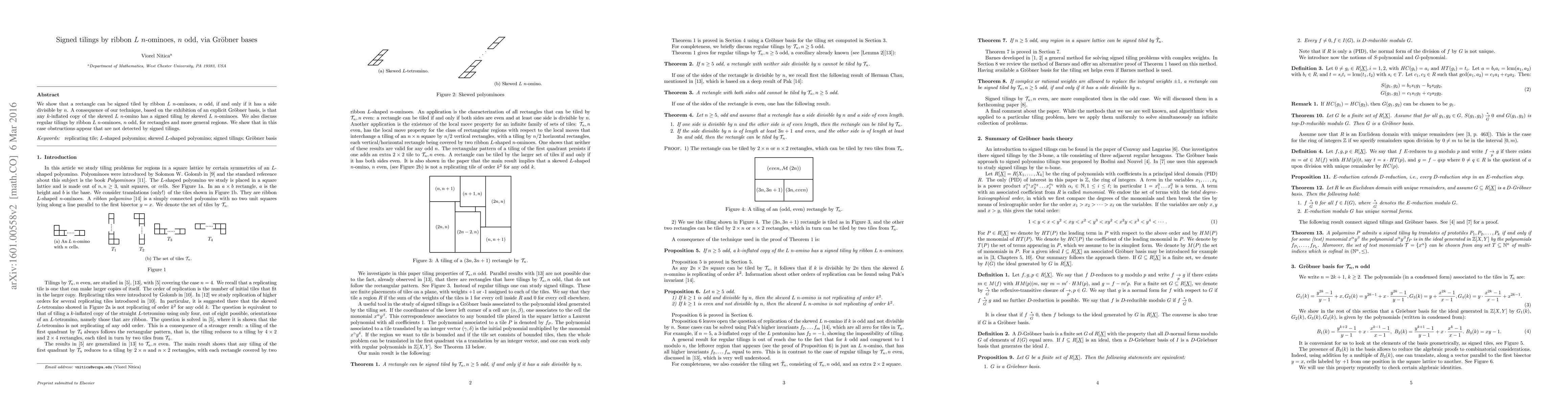 We show that a rectangle can be signed tiled by ribbon L n-ominoes, n odd, if and only if it has a side divisible by n. A consequence of our technique, based on the exhibition of an explicit Groebner basis, is that any k-inflated copy of the skewed L n-omino has a signed tiling by skewed L n-ominoes. We also discuss regular tilings by ribbon L n-ominoes, n odd, for rectangles and more general regions. We show that in this case obstructions appear that are not detected by signed tilings.