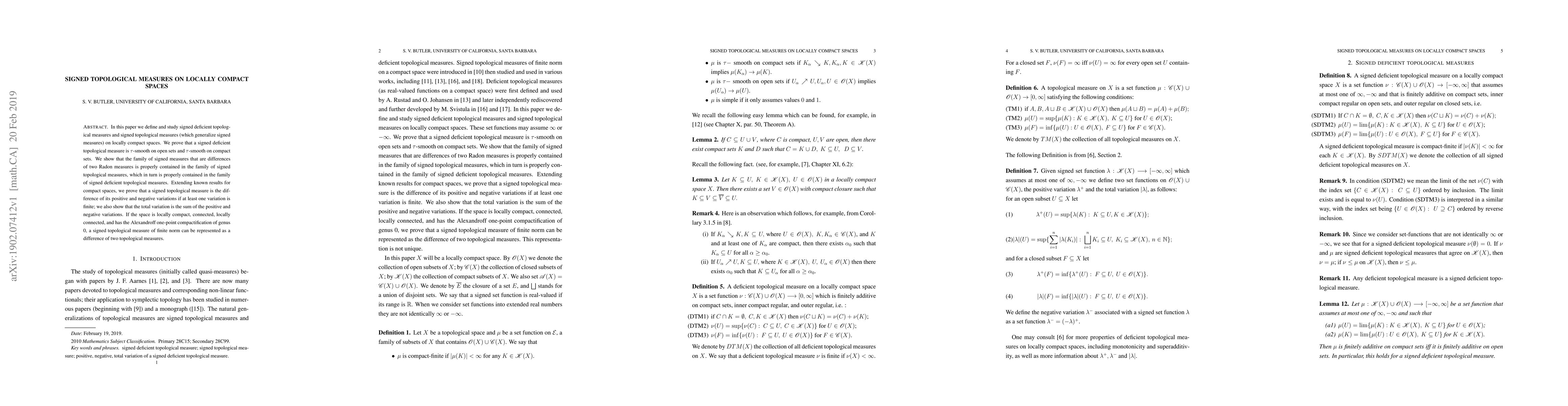 This paper introduces signed deficient topological measures and signed topological measures on locally compact spaces, proving their $\tau$-smoothness properties. It demonstrates the hierarchical relationship between these measures, signed measures, and Radon measures, and extends results for compact spaces to locally compact spaces, showing that a signed topological measure can be represented as a difference of its positive and negative variations under certain conditions.