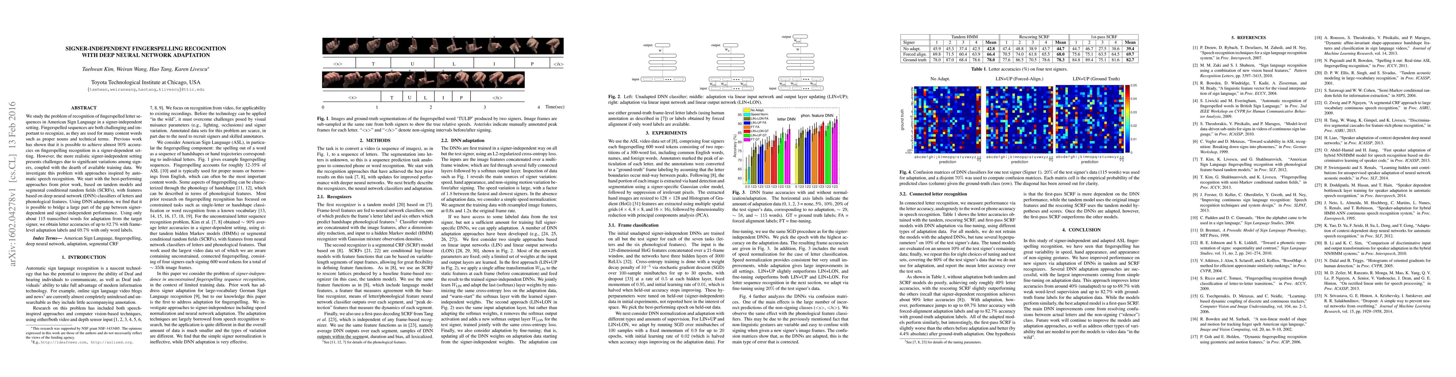 This research addresses signer-independent fingerspelling recognition in American Sign Language using deep neural networks. It finds that DNN adaptation can significantly improve accuracy, achieving up to 82.7% with frame-level adaptation labels, bridging the gap between signer-dependent and signer-independent performance.