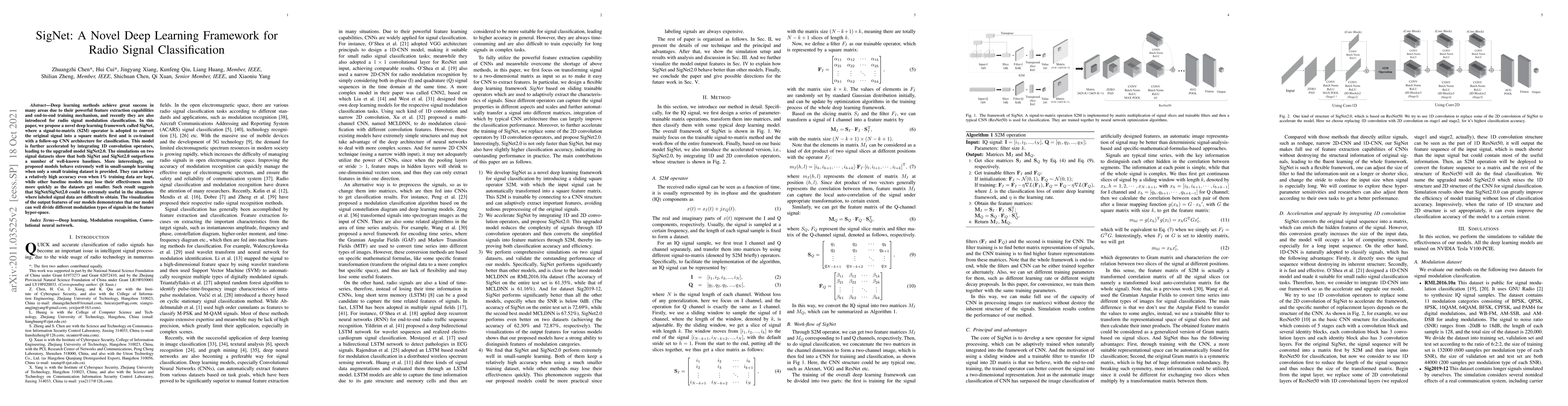 SigNet is a novel deep learning framework for radio signal classification that converts signals into matrices and employs CNNs for enhanced feature extraction. SigNet2.0, an upgraded version, integrates 1D convolutions, showing superior performance, especially in small-sample learning scenarios.