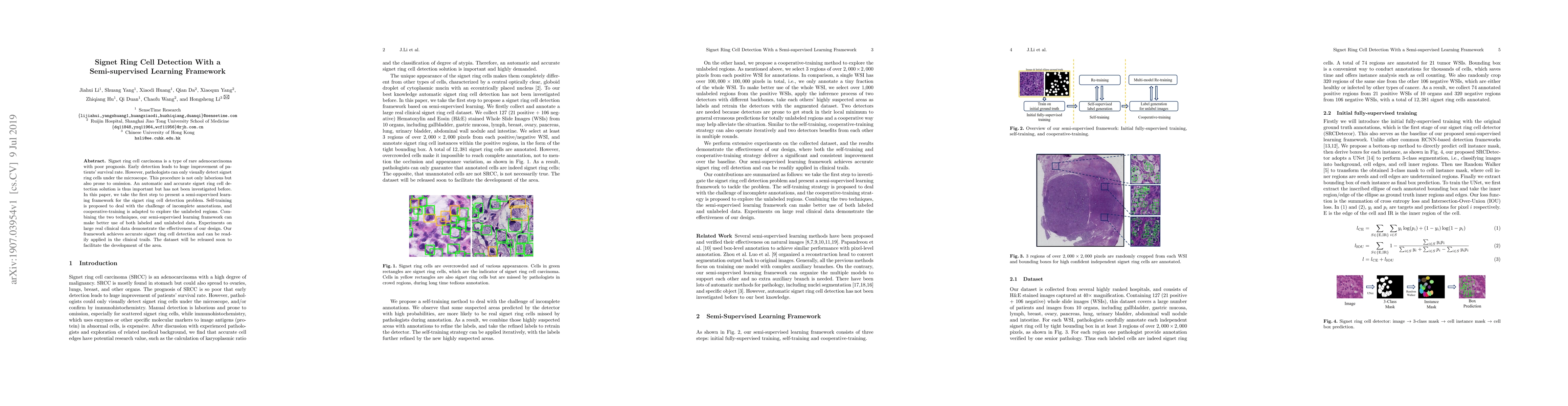 This paper introduces a semi-supervised learning framework for detecting signet ring cell carcinoma, a rare and poorly prognostic adenocarcinoma. The proposed method utilizes self-training and cooperative-training to effectively utilize both labeled and unlabeled data, demonstrating improved accuracy in detecting these cells and showing potential for clinical application.