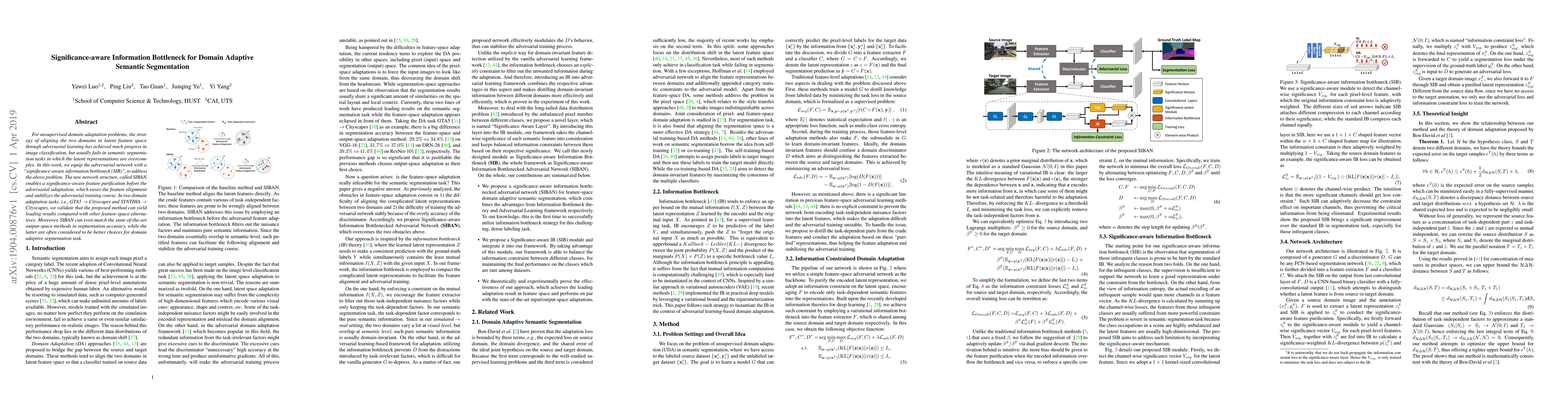 This paper proposes a "significance-aware information bottleneck" (SIB) to enhance unsupervised domain adaptation for semantic segmentation. The new SIBAN network structure purifies features before adversarial adaptation, achieving leading results in GTA5 -> Cityscapes and SYNTHIA -> Cityscapes domain adaptation tasks, rivaling output-space state-of-the-art methods.