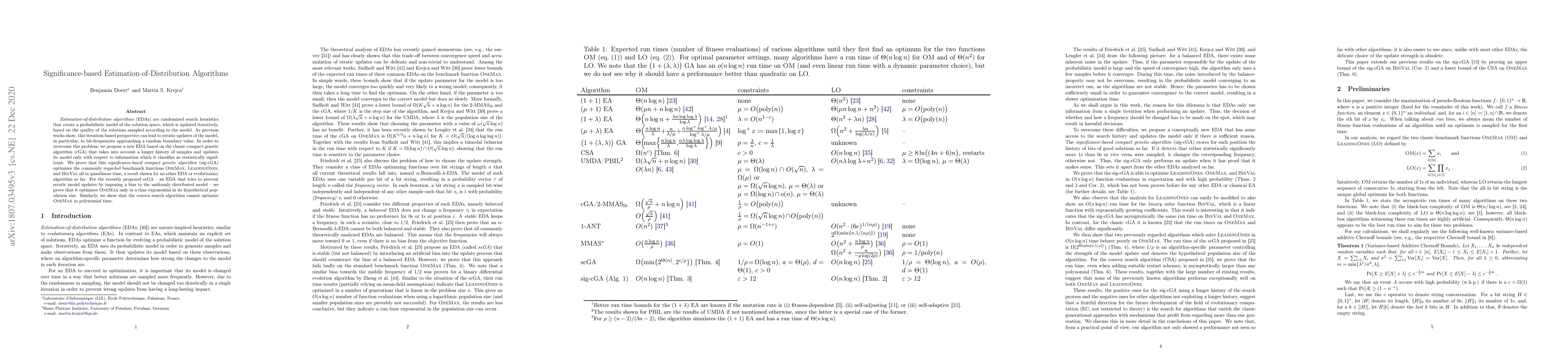 Estimation-of-distribution algorithms (EDAs) are randomized search heuristics that create a probabilistic model of the solution space, which is updated iteratively, based on the quality of the solutions sampled according to the model. As previous works show, this iteration-based perspective can lead to erratic updates of the model, in particular, to bit-frequencies approaching a random boundary value. In order to overcome this problem, we propose a new EDA based on the classic compact genetic algorithm (cGA) that takes into account a longer history of samples and updates its model only with respect to information which it classifies as statistically significant. We prove that this significance-based compact genetic algorithm (sig-cGA) optimizes the commonly regarded benchmark functions OneMax, LeadingOnes, and BinVal all in quasilinear time, a result shown for no other EDA or evolutionary algorithm so far. For the recently proposed scGA -- an EDA that tries to prevent erratic model updates by imposing a bias to the uniformly distributed model -- we prove that it optimizes OneMax only in a time exponential in its hypothetical population size. Similarly, we show that the convex search algorithm cannot optimize OneMax in polynomial time.