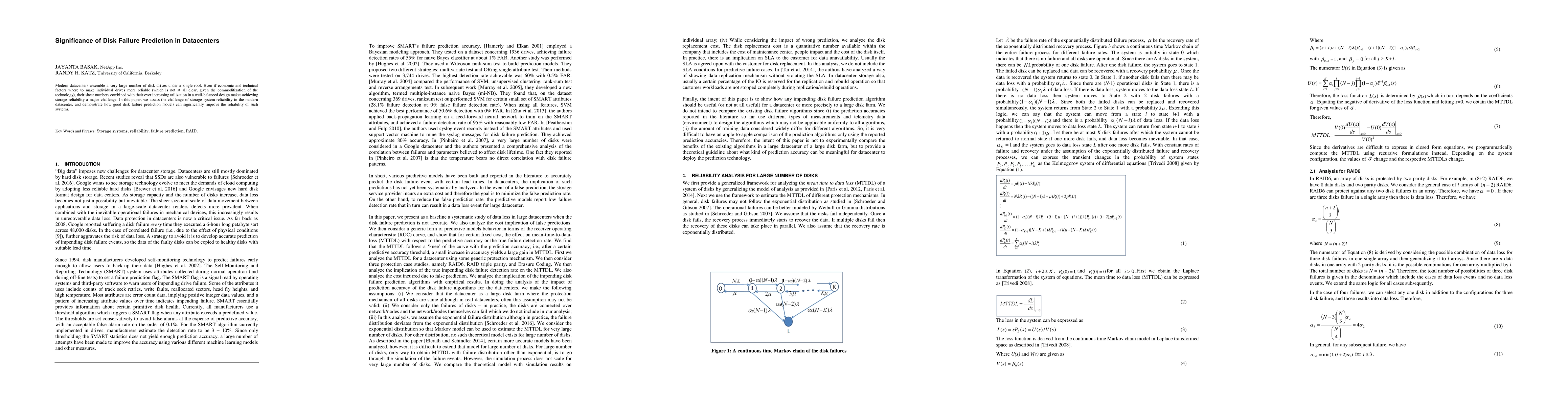 Modern datacenters assemble a very large number of disk drives under a single roof. Even if economic and technical factors where to make individual drives more reliable (which is not at all clear, given the commoditization of the technology), their sheer numbers combined with their ever increasing utilization in a well-balanced design makes achieving storage reliability a major challenge. In this paper, we assess the challenge of storage system reliability in the modern datacenter, and demonstrate how good disk failure prediction models can significantly improve the reliability of such systems.
