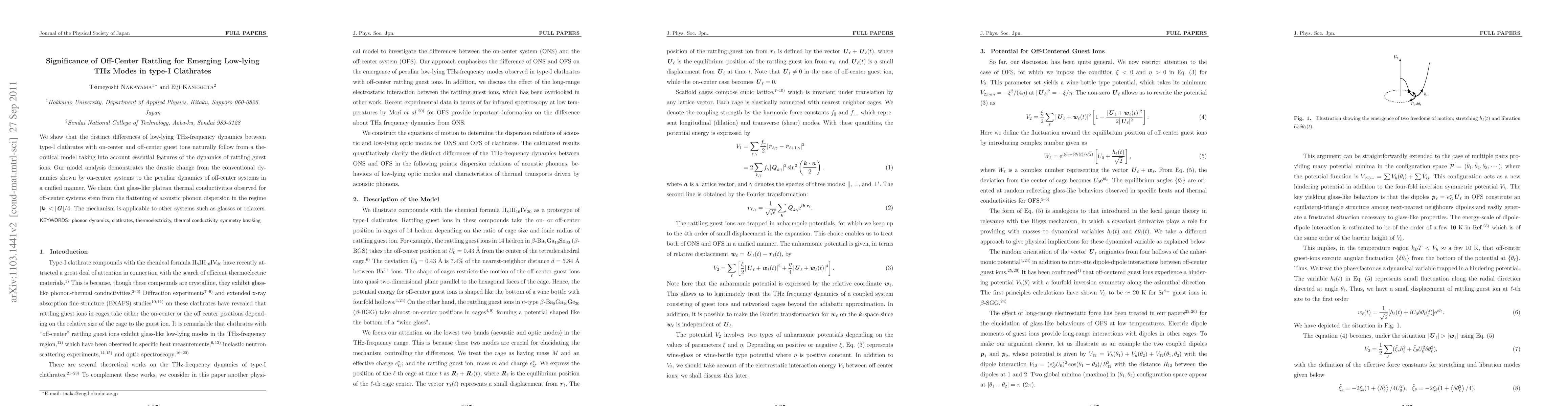 The research presents a theoretical model explaining the unique low-lying THz dynamics in type-I clathrates with off-center guest ions, contrasting with on-center systems. It suggests that glass-like thermal conductivity in off-center systems arises from acoustic phonon dispersion flattening, a mechanism applicable to other systems like glasses or relaxors.