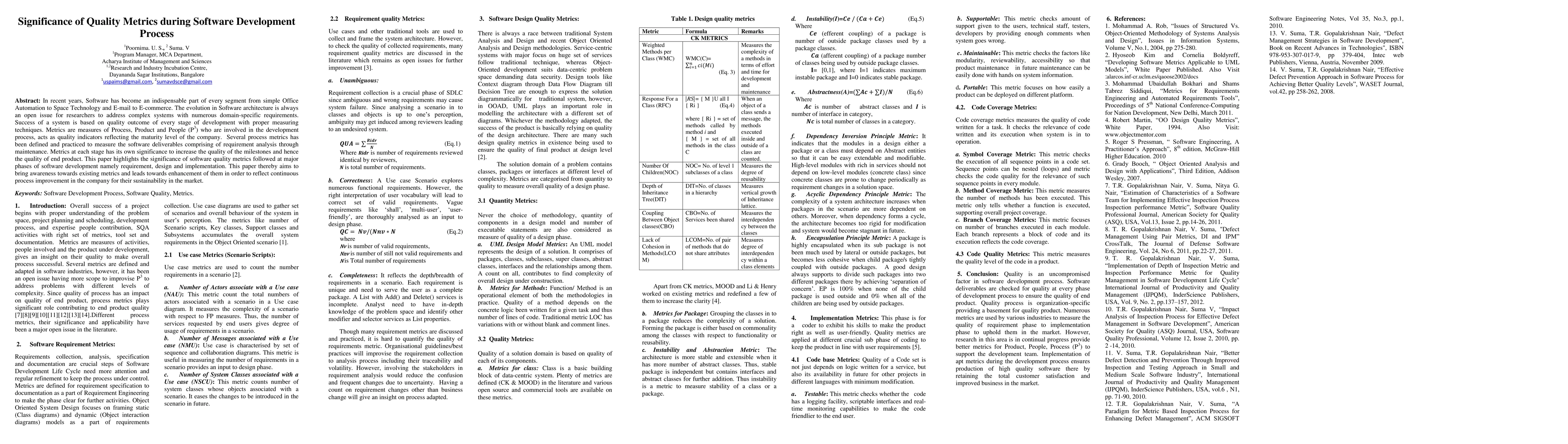 This paper explores the importance of quality metrics in software development, emphasizing their role in measuring process, product, and people at various stages like requirement, design, and implementation. It aims to raise awareness of existing metrics and promote their enhancement for continuous process improvement and market sustainability.