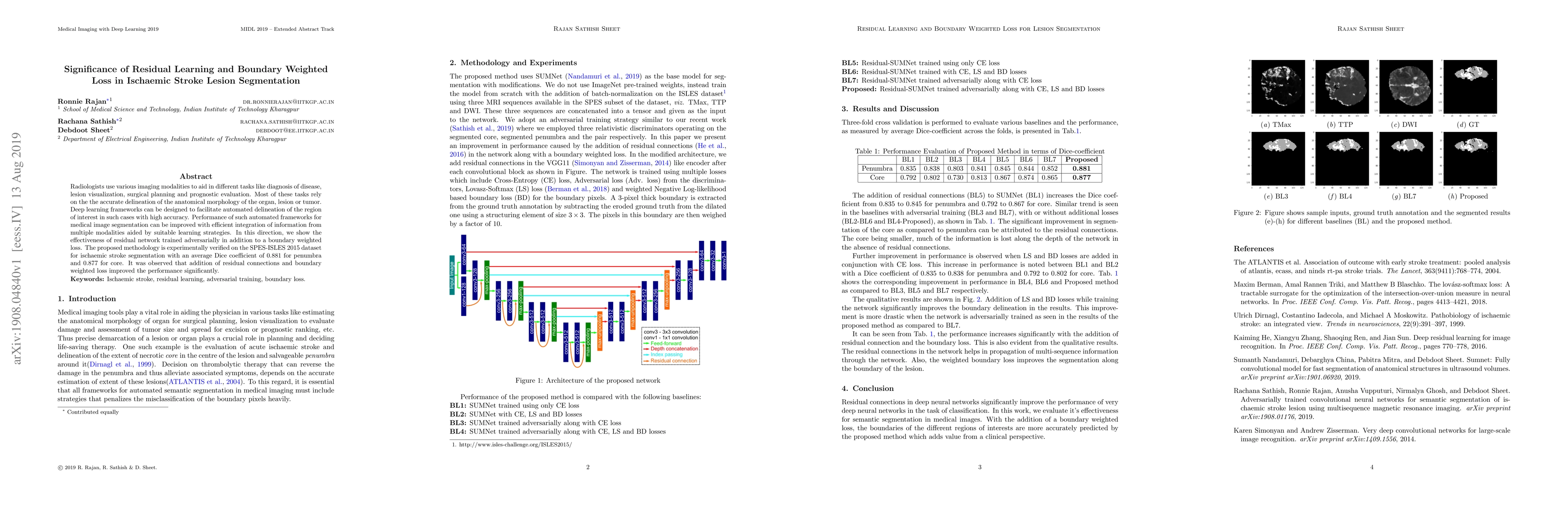 Radiologists use various imaging modalities to aid in different tasks like diagnosis of disease, lesion visualization, surgical planning and prognostic evaluation. Most of these tasks rely on the the accurate delineation of the anatomical morphology of the organ, lesion or tumor. Deep learning frameworks can be designed to facilitate automated delineation of the region of interest in such cases with high accuracy. Performance of such automated frameworks for medical image segmentation can be improved with efficient integration of information from multiple modalities aided by suitable learning strategies. In this direction, we show the effectiveness of residual network trained adversarially in addition to a boundary weighted loss. The proposed methodology is experimentally verified on the SPES-ISLES 2015 dataset for ischaemic stroke segmentation with an average Dice coefficient of $0.881$ for penumbra and $0.877$ for core. It was observed that addition of residual connections and boundary weighted loss improved the performance significantly.