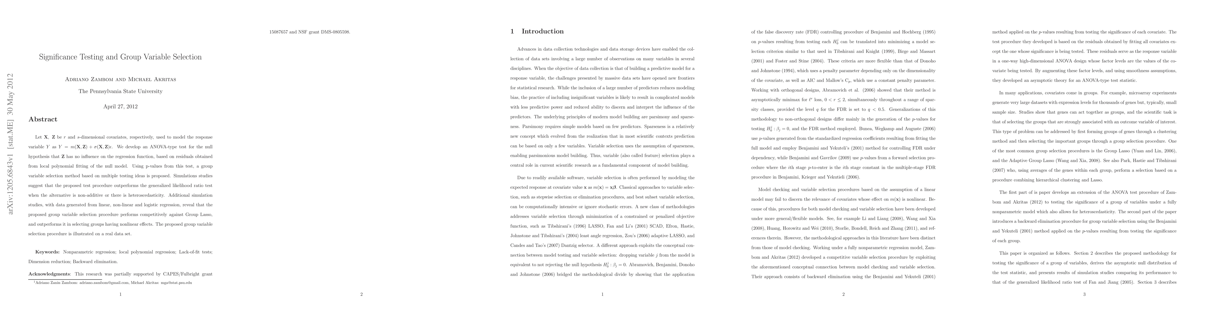 Let X; Z be r and s-dimensional covariates, respectively, used to model the response variable Y as Y = m(X;Z) + \sigma(X;Z)\epsilon. We develop an ANOVA-type test for the null hypothesis that Z has no influence on the regression function, based on residuals obtained from local polynomial fitting of the null model. Using p-values from this test, a group variable selection method based on multiple testing ideas is proposed. Simulations studies suggest that the proposed test procedure outperforms the generalized likelihood ratio test when the alternative is non-additive or there is heteroscedasticity. Additional simulation studies, with data generated from linear, non-linear and logistic regression, reveal that the proposed group variable selection procedure performs competitively against Group Lasso, and outperforms it in selecting groups having nonlinear effects. The proposed group variable selection procedure is illustrated on a real data set.