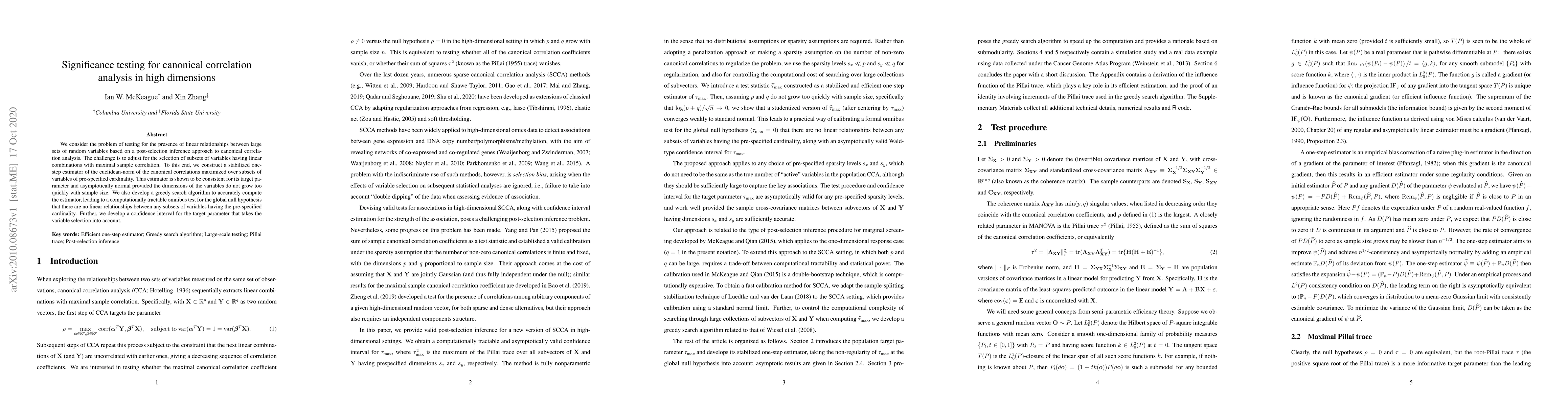 This paper proposes a post-selection inference method for testing linear relationships in high-dimensional canonical correlation analysis, developing a stabilized estimator and a greedy search algorithm for practical computation, and providing a confidence interval that accounts for variable selection. The method is shown to be consistent and asymptotically normal under certain conditions.