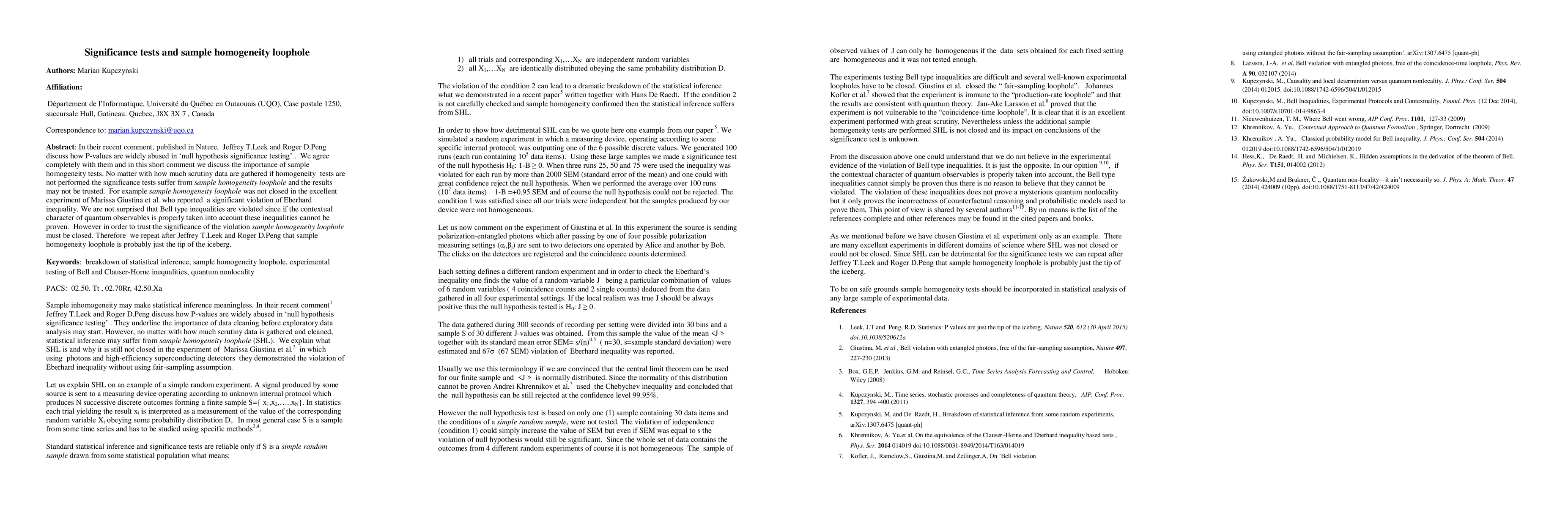 This paper agrees with Leek and Peng on the misuse of P-values in significance testing and emphasizes the importance of sample homogeneity tests. It warns that without proper homogeneity checks, the results of significance tests can be unreliable, as evidenced by the flawed experiment testing local realism.