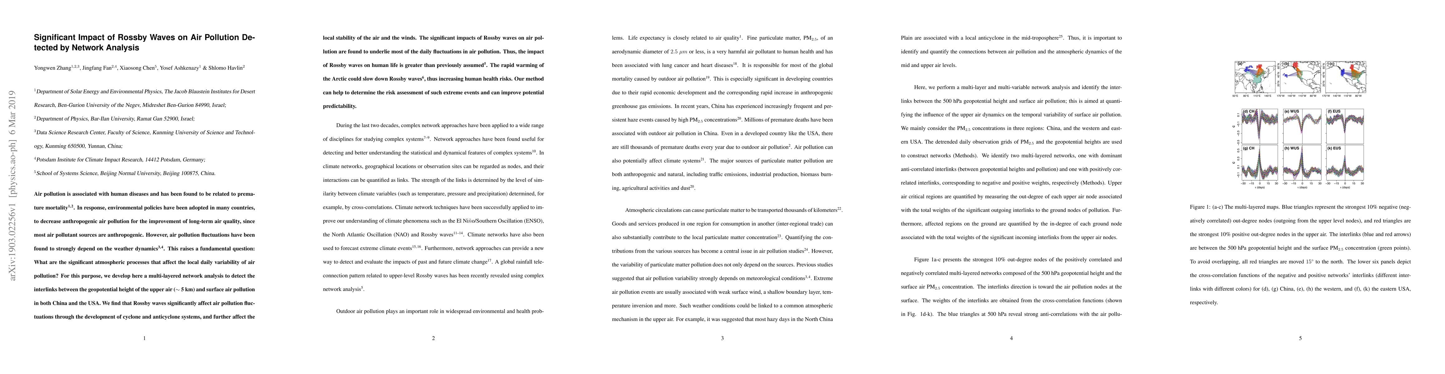 Air pollution is associated with human diseases and has been found to be related to premature mortality. In response, environmental policies have been adopted in many countries, to decrease anthropogenic air pollution for the improvement of long-term air quality, since most air pollutant sources are anthropogenic. However, air pollution fluctuations have been found to strongly depend on the weather dynamics. This raises a fundamental question: What are the significant atmospheric processes that affect the local daily variability of air pollution? For this purpose, we develop here a multi-layered network analysis to detect the interlinks between the geopotential height of the upper air (~5 km) and surface air pollution in both China and the USA. We find that Rossby waves significantly affect air pollution fluctuations through the development of cyclone and anticyclone systems, and further affect the local stability of the air and the winds. The significant impacts of Rossby waves on air pollution are found to underlie most of the daily fluctuations in air pollution. Thus, the impact of Rossby waves on human life is greater than previously assumed. The rapid warming of the Arctic could slow down Rossby waves, thus increasing human health risks. Our method can help to determine the risk assessment of such extreme events and can improve potential predictability.