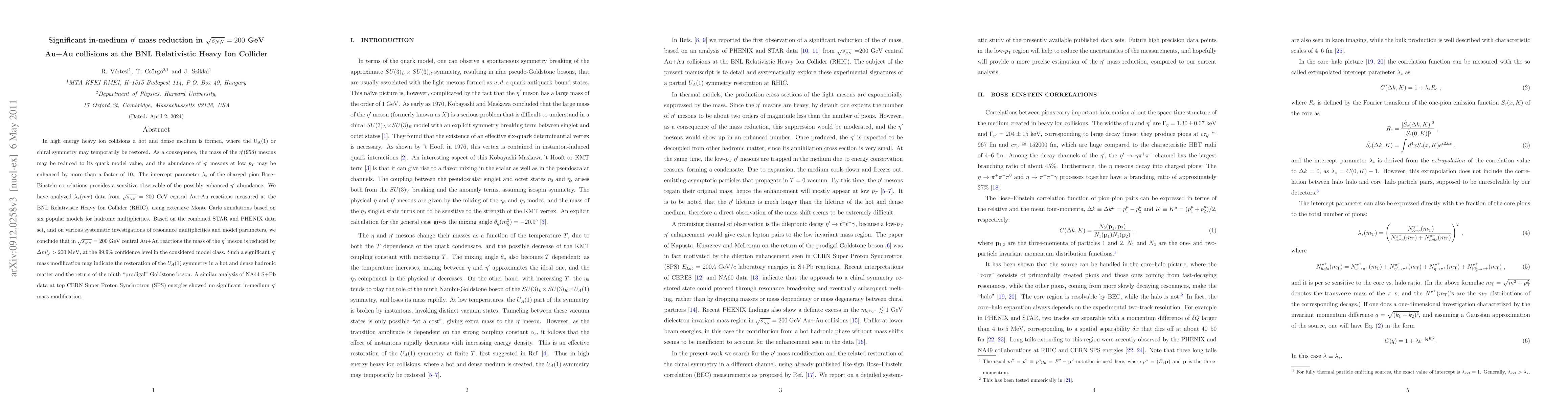 In high energy heavy ion collisions a hot and dense medium is formed, where the U_A(1) or chiral symmetry may temporarily be restored. As a consequence, the mass of the eta'(958) mesons may be reduced to its quark model value, and the abundance of eta' mesons at low p_T may be enhanced by more than a factor of 10. The intercept parameter lambda_* of the charged pion Bose--Einstein correlations provides a sensitive observable of the possibly enhanced eta' abundance. We have analyzed lambda_*(m_T) data from sqrt(s(NN))=200 GeV central Au+Au reactions measured at the BNL Relativistic Heavy Ion Collider (RHIC), using extensive Monte Carlo simulations based on six popular models for hadronic multiplicities. Based on the combined STAR and PHENIX data set, and on various systematic investigations of resonance multiplicities and model parameters, we conclude that in sqrt(s(NN))=200 GeV central Au+Au reactions the mass of the eta' meson is reduced by Delta m > 200 MeV, at the 99.9% confidence level in the considered model class. Such a significant eta' mass modification may indicate the restoration of the U_A(1) symmetry in a hot and dense hadronic matter and the return of the ninth "prodigal" Goldstone boson. A similar analysis of NA44 S+Pb data at top CERN Super Proton Synchrotron (SPS) energies showed no significant in-medium eta' mass modification.