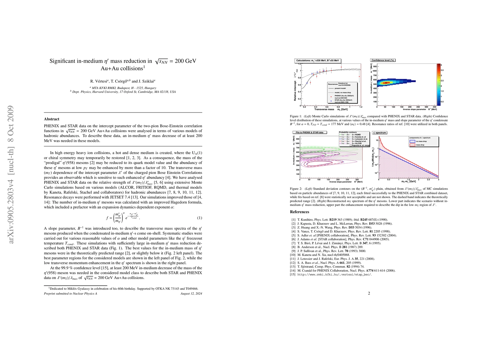 The PHENIX and STAR experiments observed a significant in-medium reduction of at least 200 MeV in the mass of $\eta^\prime$ mesons in $\sqrt{s_{NN}} = 200$ GeV Au+Au collisions, indicating strong interactions in the produced medium. This mass decrease is consistent across various models of hadronic abundances.