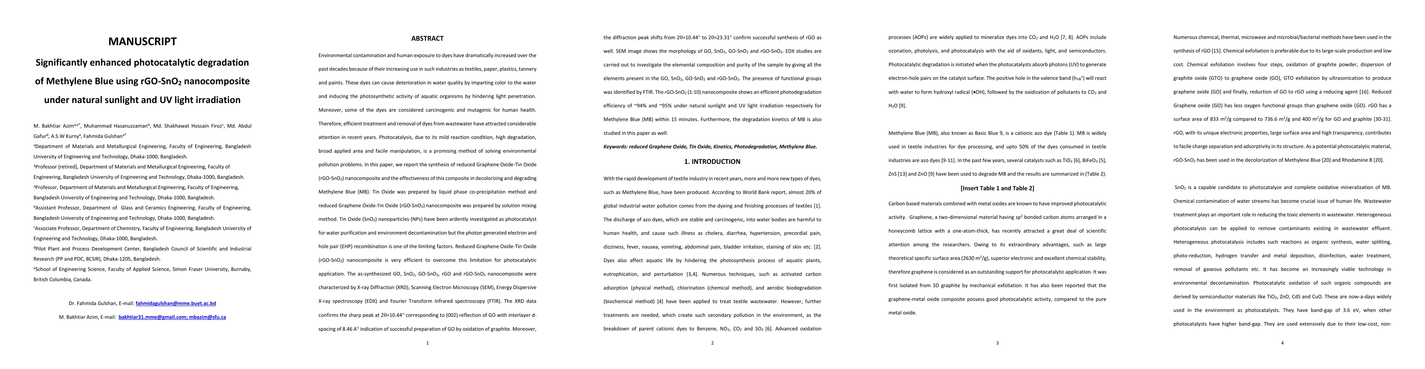 This research synthesizes reduced Graphene Oxide-Tin Oxide (rGO-SnO2) nanocomposite, demonstrating its highly effective photocatalytic degradation of Methylene Blue under both natural sunlight and UV light, achieving efficiencies of ~94% and ~95% respectively within 15 minutes. Characterization techniques confirm the successful synthesis and composition of the nanocomposite.