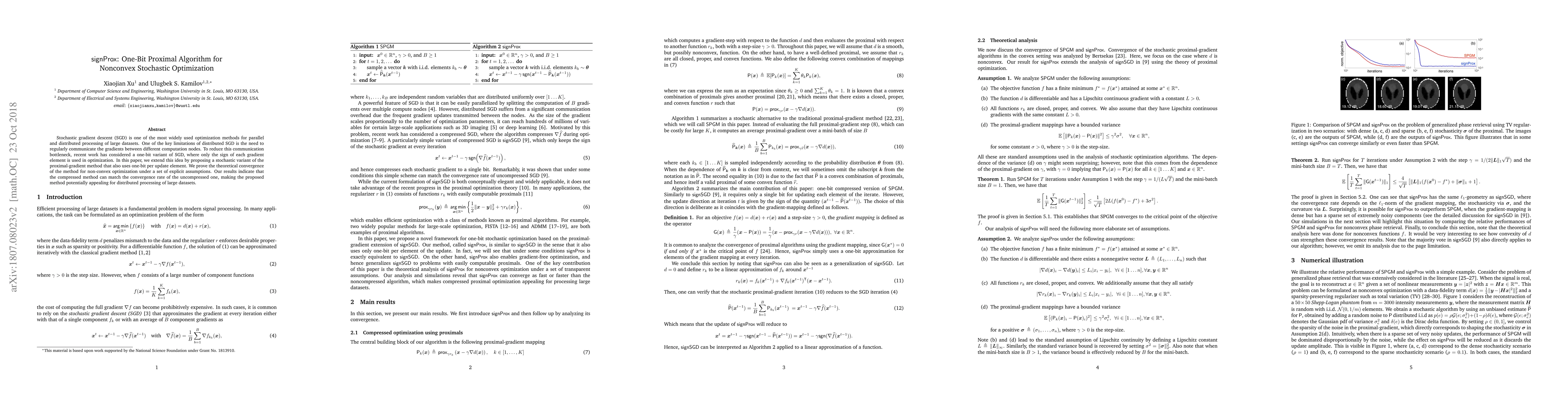 The paper proposes signProx, a one-bit proximal algorithm for nonconvex stochastic optimization to reduce communication costs in distributed SGD. It theoretically proves convergence and demonstrates comparable convergence rates to standard proximal methods.