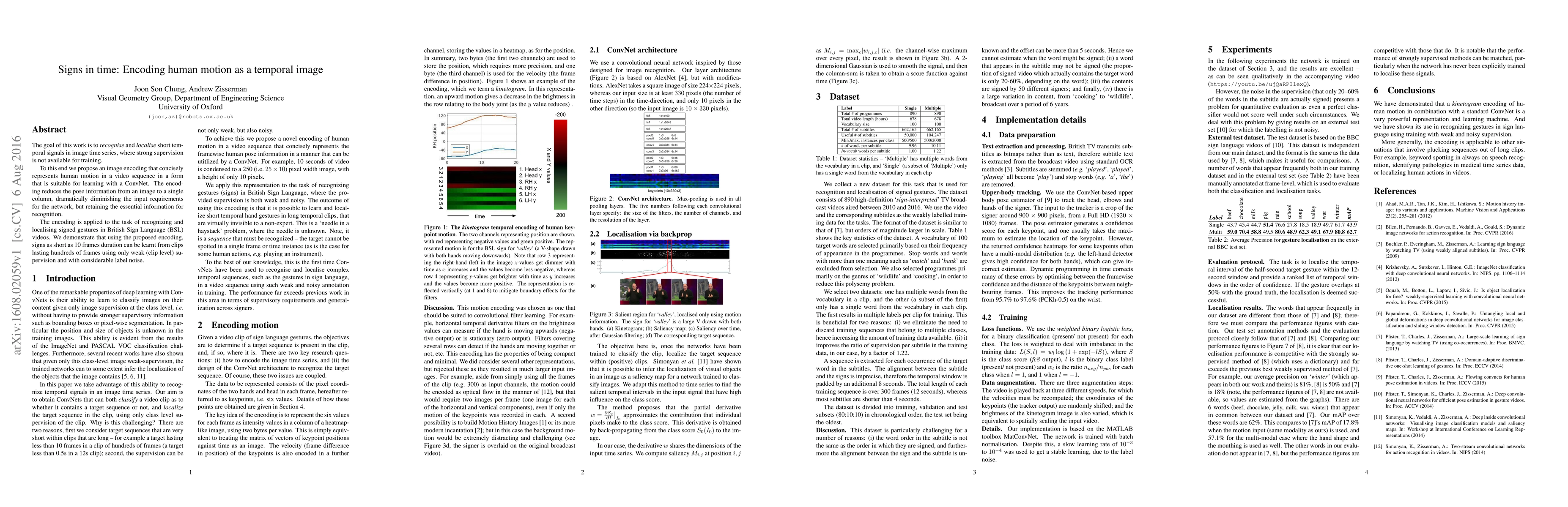 The goal of this work is to recognise and localise short temporal signals in image time series, where strong supervision is not available for training. To this end we propose an image encoding that concisely represents human motion in a video sequence in a form that is suitable for learning with a ConvNet. The encoding reduces the pose information from an image to a single column, dramatically diminishing the input requirements for the network, but retaining the essential information for recognition. The encoding is applied to the task of recognizing and localizing signed gestures in British Sign Language (BSL) videos. We demonstrate that using the proposed encoding, signs as short as 10 frames duration can be learnt from clips lasting hundreds of frames using only weak (clip level) supervision and with considerable label noise.