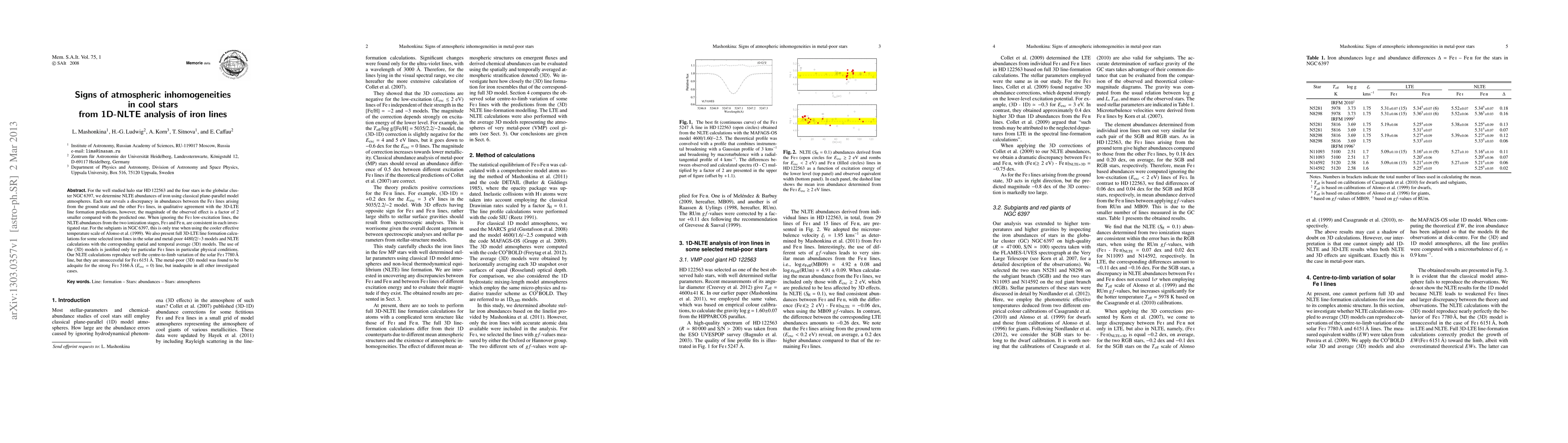 The study examines atmospheric inhomogeneities in cool stars using 1D-NLTE analysis of iron lines in HD 122563 and four NGC 6397 stars. Discrepancies are found between Fe I ground state and other Fe I lines, smaller than 3D-LTE predictions. NLTE abundances from Fe I and Fe II match when excluding low-excitation lines, especially for NGC 6397 subgiants with a cooler effective temperature scale. 3D-LTE and NLTE calculations show mixed success in replicating solar and metal-poor iron line variations, highlighting the complexity of modeling atmospheric inhomogeneities.