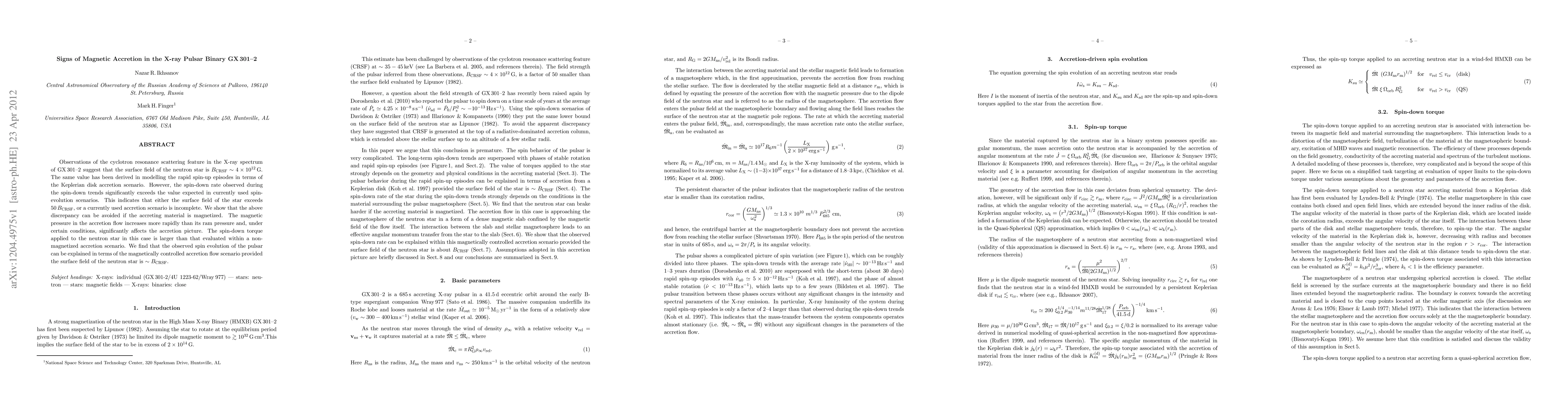 The X-ray pulsar binary GX 301-2 exhibits magnetic accretion, as indicated by the cyclotron resonance scattering feature, suggesting a neutron star surface field of 4 x 10^{12}G. The observed spin-down rate exceeds predictions, indicating either a much stronger magnetic field or an incomplete accretion model, which is resolved by considering a magnetized accretion flow that enhances the spin-down torque.