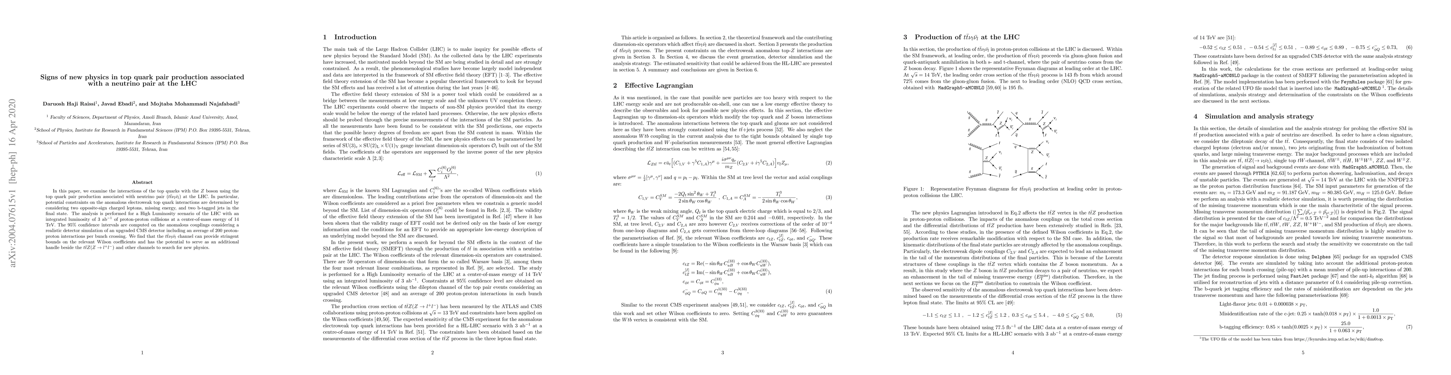 In this paper, we examine the interactions of the top quarks with the $Z$ boson using the top quark pair production associated with neutrino pair ($t\bar{t}\nu_{l}\bar{\nu_{l}}$) at the LHC. In particular, potential constraints on the anomalous electroweak top-quark interactions are determined by considering two opposite-sign charged leptons, missing energy, and two b-tagged jets in the final state. The analysis is performed for a High Luminosity scenario of the LHC with an integrated luminosity of 3 ab$^{-1}$ of proton-proton collisions at a center-of-mass energy of 14 TeV. The $95\%$ confidence intervals are computed on the anomalous couplings considering a realistic detector simulation of an upgraded CMS detector including an average of 200 proton-proton interactions per bunch crossing. We find that the $t\bar{t}\nu_{l}\bar{\nu_{l}}$ channel can provide stringent bounds on the relevant Wilson coefficients and has the potential to serve as an additional handle beside the $t\bar{t}Z(Z\rightarrow l^{+}l^{-})$ and other channels to search for new physics.