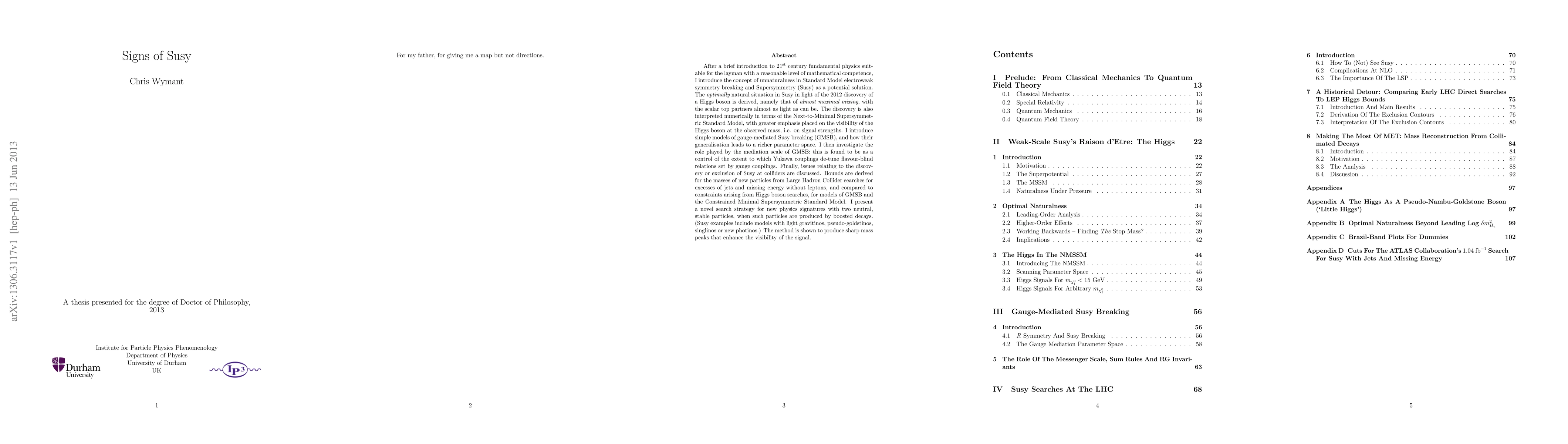 This doctoral thesis addresses aspects of Supersymmetry (Susy) phenomenology. In addition to previously published work, it contains introductions to the following topics: from classical mechanics to quantum field theory for the more casual reader, electroweak naturalness, the Higgs as a pseudo-Nambu-Goldstone boson, the MSSM and NMSSM, simple and less simple models of gauge-mediated Susy breaking (GMSB), collider searches for Susy and other new theories, transverse mass observables with missing energy, and Brazil-band plots. The previously published work is as follows. The optimally natural Higgs-stop sector in the MSSM in light of the 2012 discovery of a Higgs boson is derived, namely that of almost maximal mixing, with the scalar top partners almost as light as can be. The discovery is also interpreted numerically in the NMSSM, with greater emphasis placed on the visibility of the Higgs boson at the observed mass, i.e. on signal strengths. I investigate the role played by the mediation scale of GMSB: this is found to be as a control of the extent to which Yukawa couplings de-tune flavour-blind relations set by gauge couplings. Finally, issues relating to the discovery or exclusion of Susy at colliders are discussed. Bounds are derived for the masses of new particles from LHC searches for excesses of jets and missing energy without leptons, and compared to constraints arising from Higgs boson searches, for models of GMSB and the Constrained Minimal Supersymmetric Standard Model. I present a novel search strategy for new physics signatures with two neutral, stable particles, when such particles are produced by boosted decays. (Susy motivations include models with light gravitinos, pseudo-goldstinos, singlinos or new photinos.) The method is shown to produce sharp mass peaks that enhance the visibility of the signal, with mass reconstruction to 5% from O(100) events.