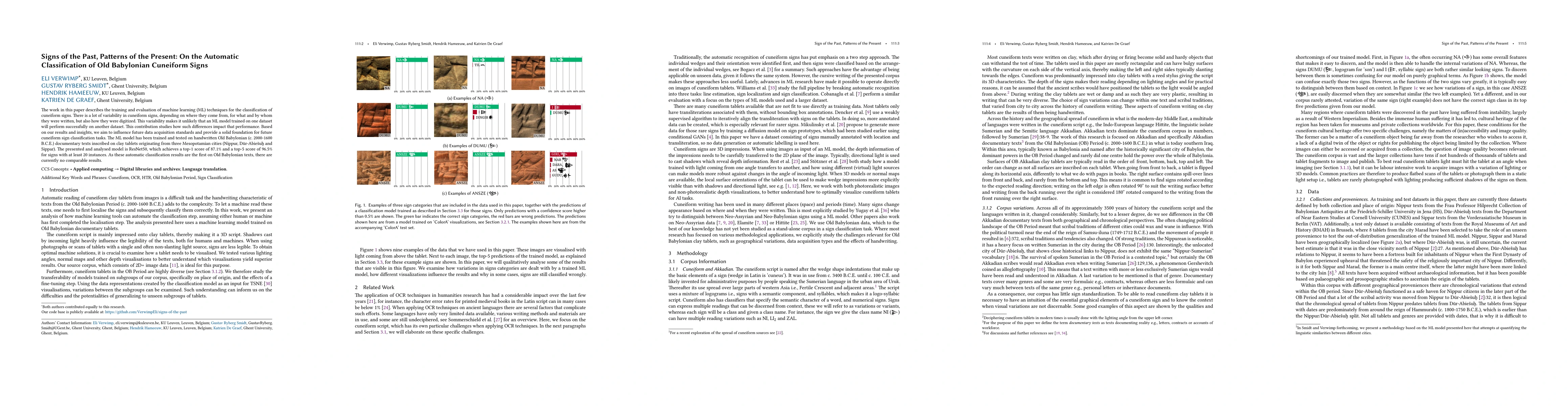 The work in this paper describes the training and evaluation of machine learning (ML) techniques for the classification of cuneiform signs. There is a lot of variability in cuneiform signs, depending on where they come from, for what and by whom they were written, but also how they were digitized. This variability makes it unlikely that an ML model trained on one dataset will perform successfully on another dataset. This contribution studies how such differences impact that performance. Based on our results and insights, we aim to influence future data acquisition standards and provide a solid foundation for future cuneiform sign classification tasks. The ML model has been trained and tested on handwritten Old Babylonian (c. 2000-1600 B.C.E.) documentary texts inscribed on clay tablets originating from three Mesopotamian cities (Nippur, D\=ur-Abie\v{s}uh and Sippar). The presented and analysed model is ResNet50, which achieves a top-1 score of 87.1% and a top-5 score of 96.5% for signs with at least 20 instances. As these automatic classification results are the first on Old Babylonian texts, there are currently no comparable results.