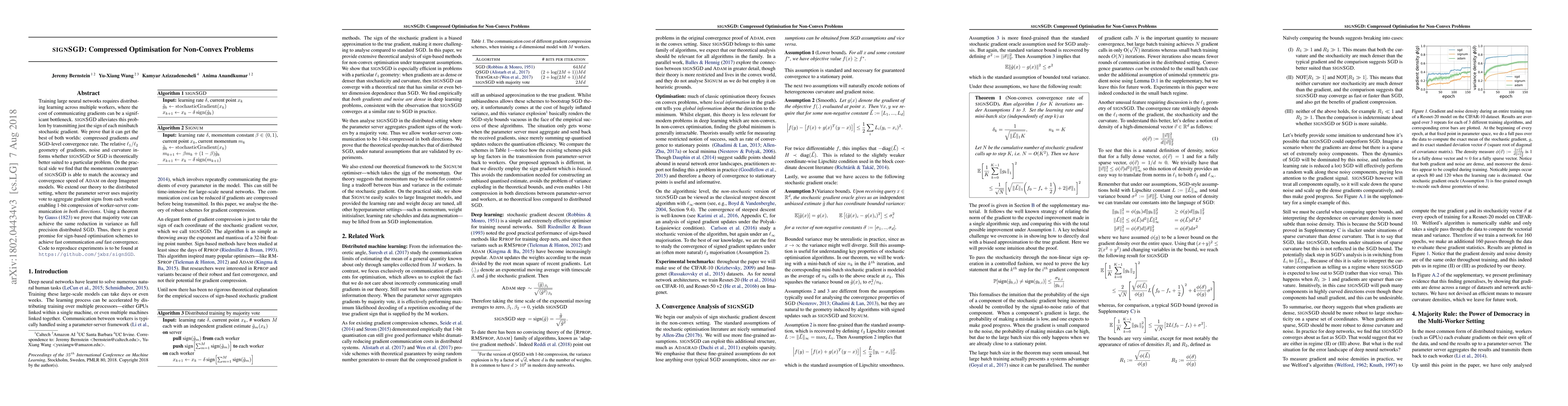 Training large neural networks requires distributing learning across multiple workers, where the cost of communicating gradients can be a significant bottleneck. signSGD alleviates this problem by transmitting just the sign of each minibatch stochastic gradient. We prove that it can get the best of both worlds: compressed gradients and SGD-level convergence rate. The relative $\ell_1/\ell_2$ geometry of gradients, noise and curvature informs whether signSGD or SGD is theoretically better suited to a particular problem. On the practical side we find that the momentum counterpart of signSGD is able to match the accuracy and convergence speed of Adam on deep Imagenet models. We extend our theory to the distributed setting, where the parameter server uses majority vote to aggregate gradient signs from each worker enabling 1-bit compression of worker-server communication in both directions. Using a theorem by Gauss we prove that majority vote can achieve the same reduction in variance as full precision distributed SGD. Thus, there is great promise for sign-based optimisation schemes to achieve fast communication and fast convergence. Code to reproduce experiments is to be found at https://github.com/jxbz/signSGD .