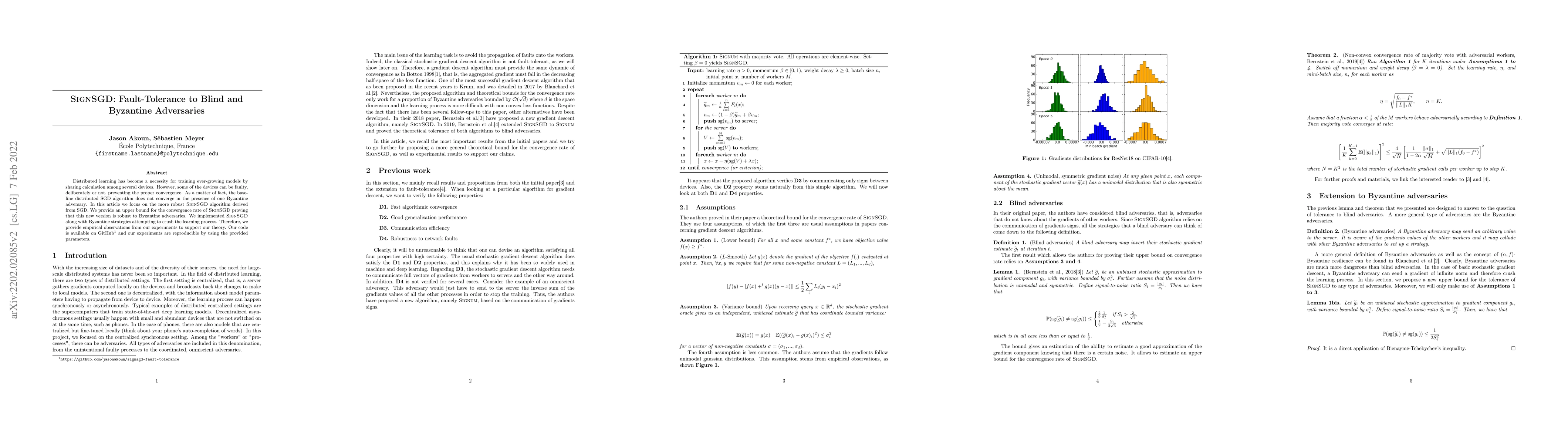Distributed learning has become a necessity for training ever-growing models by sharing calculation among several devices. However, some of the devices can be faulty, deliberately or not, preventing the proper convergence. As a matter of fact, the baseline distributed SGD algorithm does not converge in the presence of one Byzantine adversary. In this article we focus on the more robust SignSGD algorithm derived from SGD. We provide an upper bound for the convergence rate of SignSGD proving that this new version is robust to Byzantine adversaries. We implemented SignSGD along with Byzantine strategies attempting to crush the learning process. Therefore, we provide empirical observations from our experiments to support our theory. Our code is available on GitHub https://github.com/jasonakoun/signsgd-fault-tolerance and our experiments are reproducible by using the provided parameters.