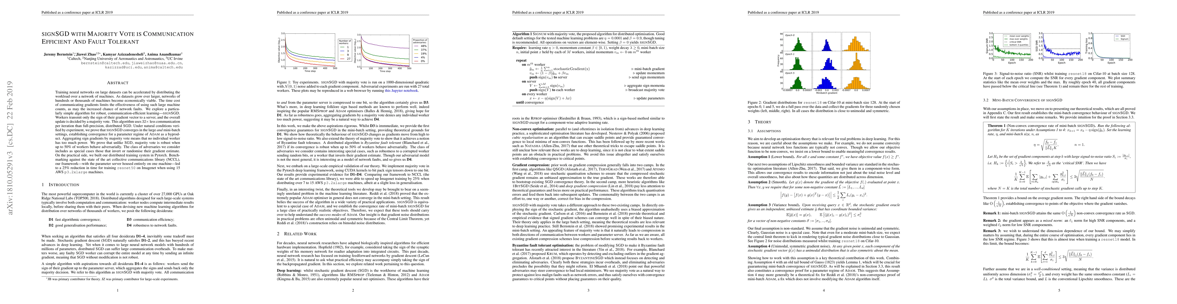 A new algorithm called signSGD reduces communication costs in large-scale neural network training while maintaining fault tolerance, outperforming existing methods with a 25% reduction in training time on a large machine setup.