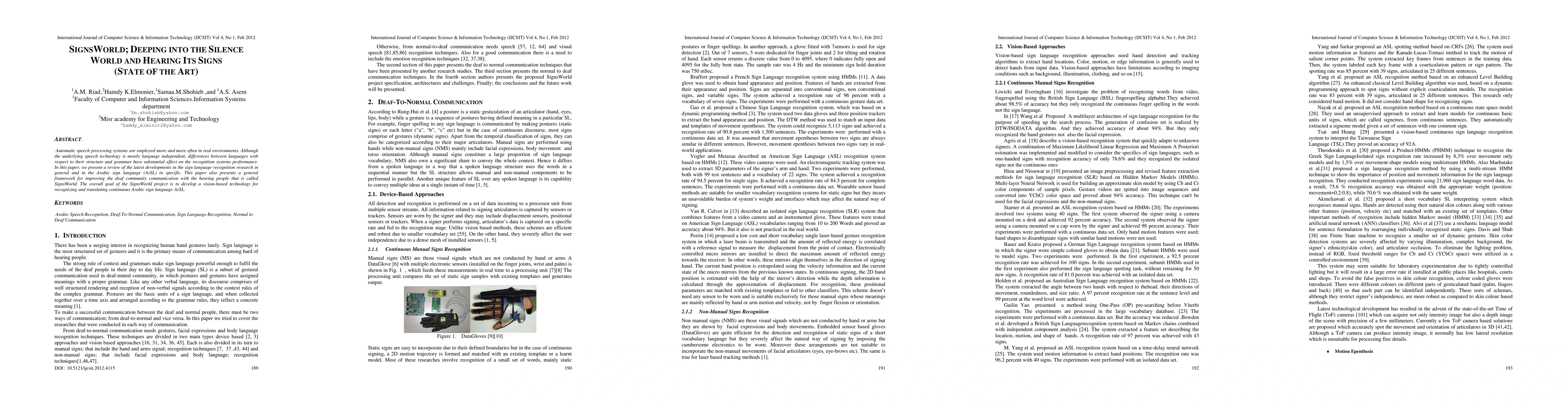 Automatic speech processing systems are employed more and more often in real environments. Although the underlying speech technology is mostly language independent, differences between languages with respect to their structure and grammar have substantial effect on the recognition systems performance. In this paper, we present a review of the latest developments in the sign language recognition research in general and in the Arabic sign language (ArSL) in specific. This paper also presents a general framework for improving the deaf community communication with the hearing people that is called SignsWorld. The overall goal of the SignsWorld project is to develop a vision-based technology for recognizing and translating continuous Arabic sign language ArSL.