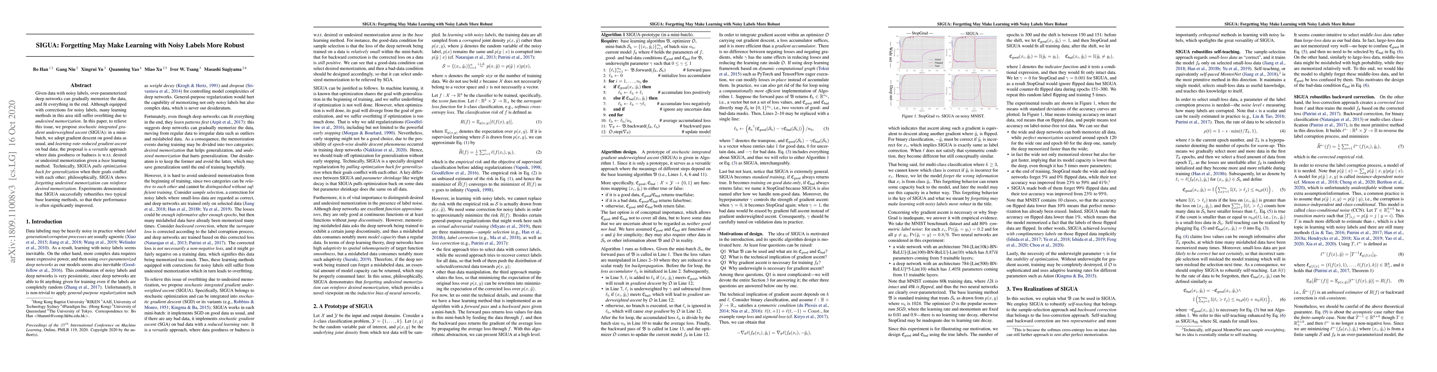 Given data with noisy labels, over-parameterized deep networks can gradually memorize the data, and fit everything in the end. Although equipped with corrections for noisy labels, many learning methods in this area still suffer overfitting due to undesired memorization. In this paper, to relieve this issue, we propose stochastic integrated gradient underweighted ascent (SIGUA): in a mini-batch, we adopt gradient descent on good data as usual, and learning-rate-reduced gradient ascent on bad data; the proposal is a versatile approach where data goodness or badness is w.r.t. desired or undesired memorization given a base learning method. Technically, SIGUA pulls optimization back for generalization when their goals conflict with each other; philosophically, SIGUA shows forgetting undesired memorization can reinforce desired memorization. Experiments demonstrate that SIGUA successfully robustifies two typical base learning methods, so that their performance is often significantly improved.