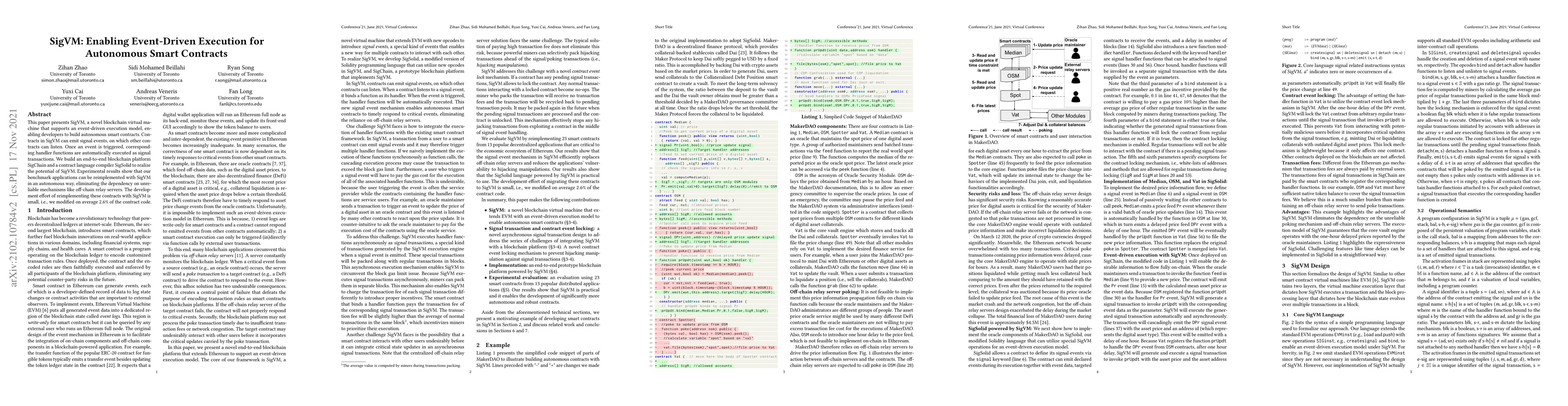 SigVM introduces a blockchain virtual machine that supports event-driven execution for autonomous smart contracts, allowing contracts to emit and respond to signal events without reliance on off-chain mechanisms. Experimental results demonstrate minimal code modifications (2.6%) for reimplementation, showcasing the platform's potential.