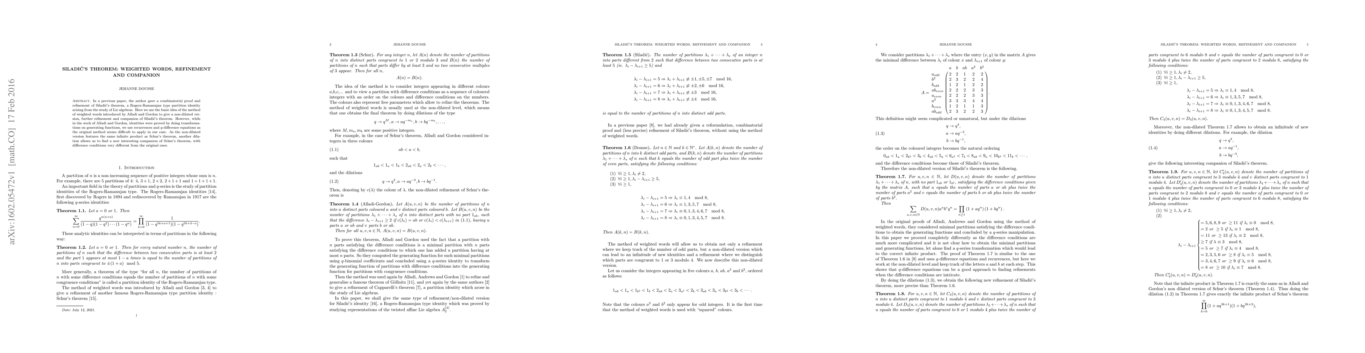 Siladić's theorem, a Rogers-Ramanujan type partition identity, is refined and given a non-dilated version using weighted words and $q$-difference equations, instead of transformations on generating functions. A new companion of Schur's theorem is also derived, featuring different difference conditions.