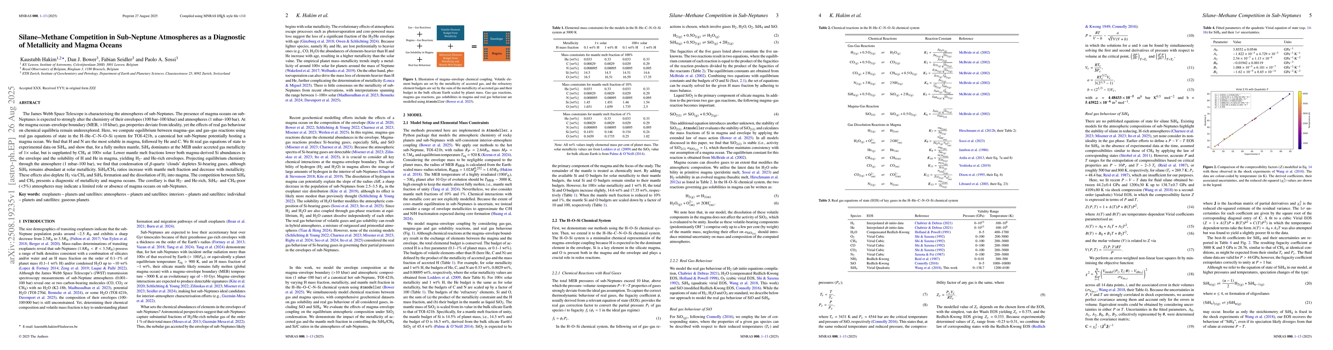 The James Webb Space Telescope is characterising the atmospheres of sub-Neptunes. The presence of magma oceans on sub-Neptunes is expected to strongly alter the chemistry of their envelopes (100 bar-100 kbar) and atmospheres (1 mbar-100 bar). At the magma ocean-envelope boundary (MEB, >10 kbar), gas properties deviate from ideality, yet the effects of real gas behaviour on chemical equilibria remain underexplored. Here, we compute equilibrium between magma-gas and gas-gas reactions using real gas equations of state in the H-He-C-N-O-Si system for TOI-421b, a canonical hot sub-Neptune potentially hosting a magma ocean. We find that H and N are the most soluble in magma, followed by He and C. We fit real gas equations of state to experimental data on SiH$_4$, and show that, for a fully molten mantle, SiH$_4$ dominates at the MEB under accreted gas metallicity of 1$\times$ solar, but is supplanted by CH$_4$ at 100$\times$ solar. Lower mantle melt fractions lower both magma-derived Si abundances in the envelope and the solubility of H and He in magma, yielding H$_2$- and He-rich envelopes. Projecting equilibrium chemistry through the atmosphere (1 mbar-100 bar), we find that condensation of $\beta$-quartz 'clouds' depletes Si-bearing gases, although SiH$_4$ remains abundant at solar metallicity. SiH$_4$/CH$_4$ ratios increase with mantle melt fraction and decrease with metallicity. These effects also deplete H$_2$ via CH$_4$ and SiH$_4$ formation and the dissolution of H$_2$ into magma. The competition between SiH$_4$ and CH$_4$ presents a diagnostic of metallicity and magma oceans. The corollary is that H$_2$- and He-rich, SiH$_4$- and CH$_4$-poor (<5%) atmospheres may indicate a limited role or absence of magma oceans on sub-Neptunes.