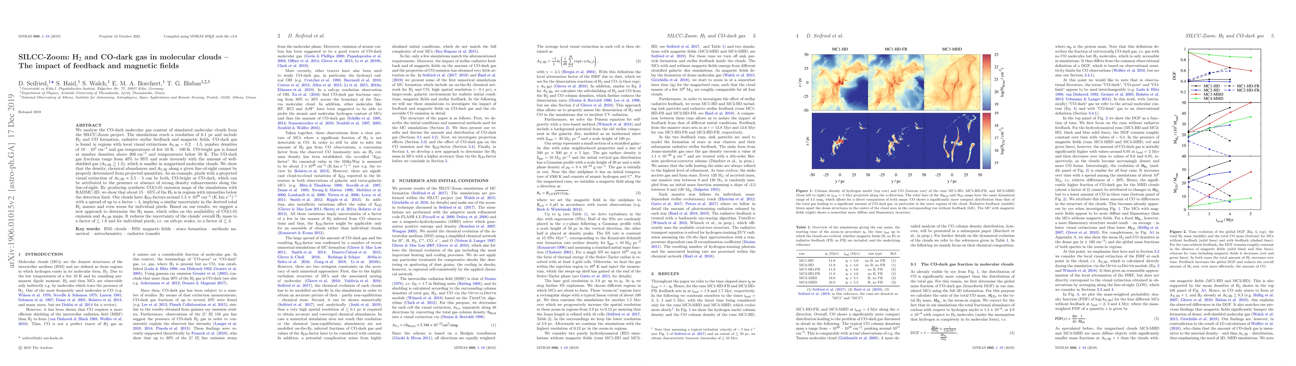 We analyse the CO-dark molecular gas content of simulated molecular clouds from the SILCC-Zoom project. The simulations reach a resolution of 0.1 pc and include H$_2$ and CO formation, radiative stellar feedback and magnetic fields. CO-dark gas is found in regions with local visual extinctions $A_\text{V, 3D} \sim$ 0.2 - 1.5, number densities of 10 - 10$^{3}$ cm$^{-3}$ and gas temperatures of few 10 K - 100 K. CO-bright gas is found at number densities above 300 cm$^{-3}$ and temperatures below 50 K. The CO-dark gas fractions range from 40% to 95% and scale inversely with the amount of well-shielded gas ($A_\text{V, 3D}$ $\gtrsim$ 1.5), which is smaller in magnetised molecular clouds. We show that the density, chemical abundances and $A_\text{V, 3D}$ along a given line-of-sight cannot be properly determined from projected quantities. As an example, pixels with a projected visual extinction of $A_\text{V, 2D} \simeq$ 2.5 - 5 can be both, CO-bright or CO-dark, which can be attributed to the presence or absence of strong density enhancements along the line-of-sight. By producing synthetic CO(1-0) emission maps of the simulations with RADMC-3D, we show that about 15 - 65\% of the H$_2$ is in regions with intensities below the detection limit. Our clouds have $X_\text{CO}$-factors around 1.5 $\times$ 10$^{20}$ cm$^{-2}$ (K km s$^{-1}$)$^{-1}$ with a spread of up to a factor $\sim$ 4, implying a similar uncertainty in the derived total H$_2$ masses and even worse for individual pixels. Based on our results, we suggest a new approach to determine the H$_2$ mass, which relies on the availability of CO(1-0) emission and $A_\text{V, 2D}$ maps. It reduces the uncertainty of the clouds' overall H$_2$ mass to a factor of $\lesssim$ 1.8 and for individual pixels, i.e. on sub-pc scales, to a factor of $\lesssim$ 3.