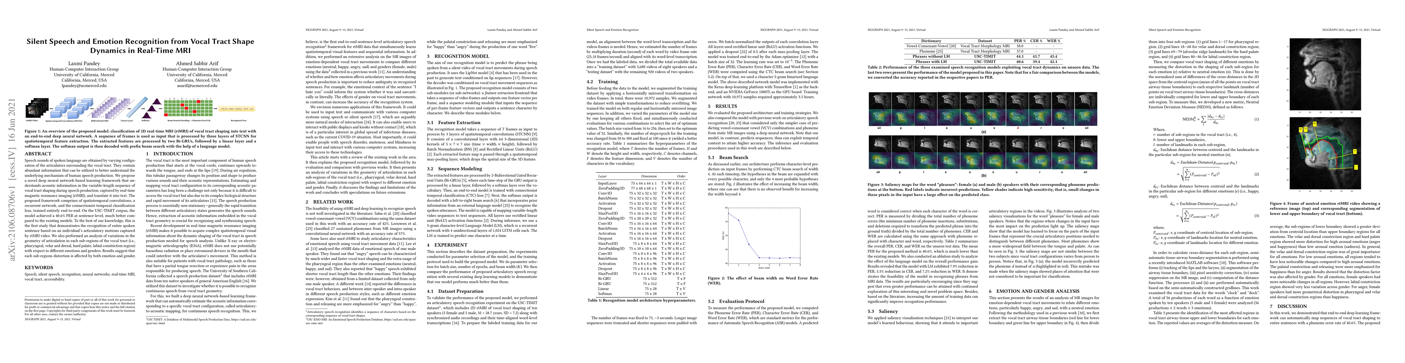 This paper proposes a deep neural network framework for recognizing silent speech and emotions from real-time MRI data of vocal tract shape dynamics. The model achieved superior sentence-level performance compared to existing models, and analyzed how vocal tract sub-regions' geometry varies with emotions and genders.