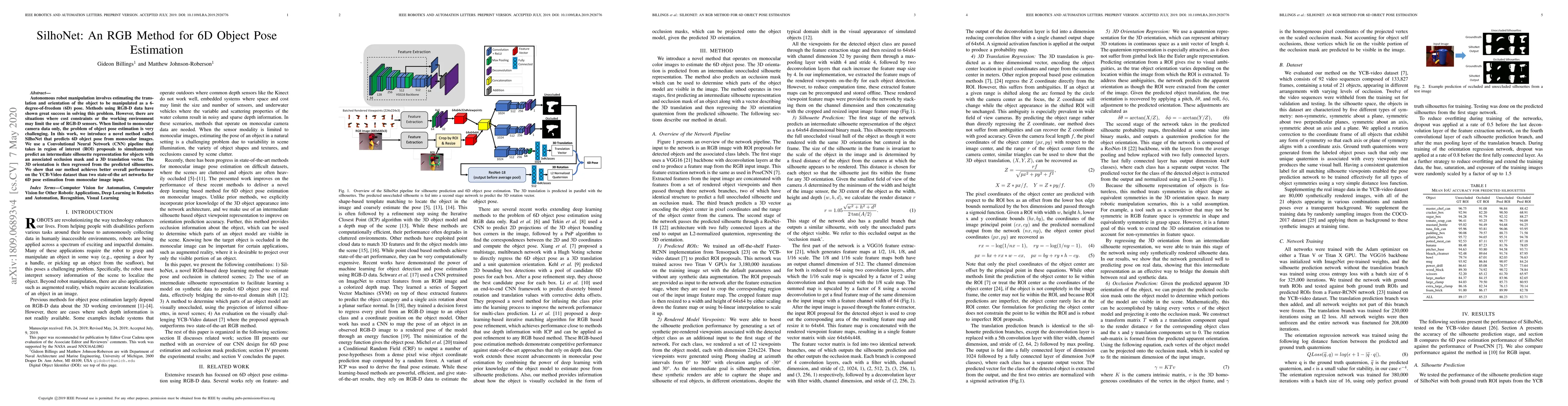 SilhoNet is a novel method for estimating 6D object pose from monocular images using a CNN that predicts silhouettes and occlusion masks, achieving superior performance on the YCB-Video dataset compared to existing monocular pose estimation techniques.