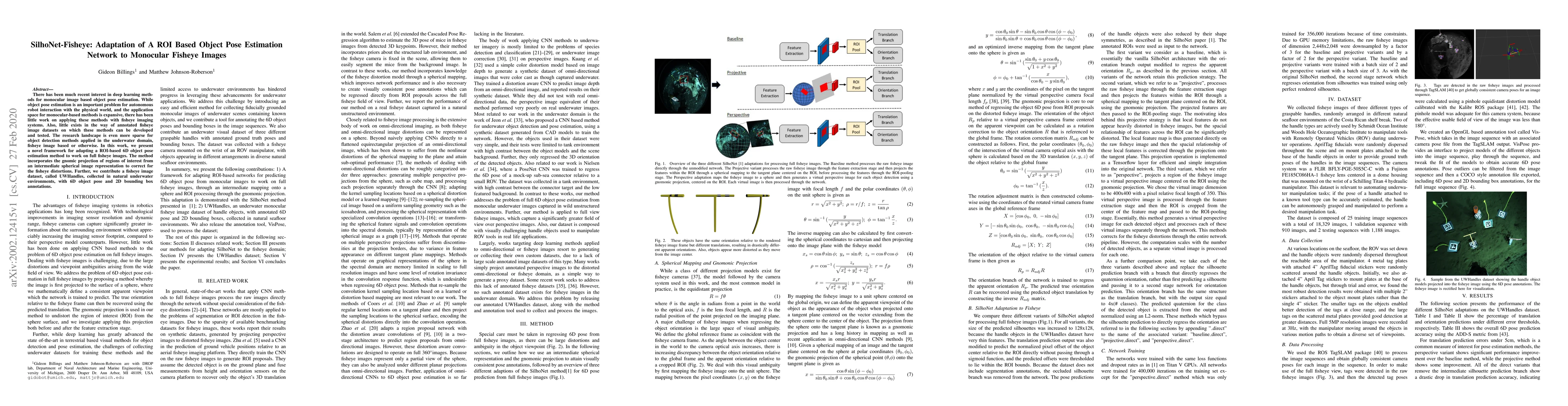 There has been much recent interest in deep learning methods for monocular image based object pose estimation. While object pose estimation is an important problem for autonomous robot interaction with the physical world, and the application space for monocular-based methods is expansive, there has been little work on applying these methods with fisheye imaging systems. Also, little exists in the way of annotated fisheye image datasets on which these methods can be developed and tested. The research landscape is even more sparse for object detection methods applied in the underwater domain, fisheye image based or otherwise. In this work, we present a novel framework for adapting a ROI-based 6D object pose estimation method to work on full fisheye images. The method incorporates the gnomic projection of regions of interest from an intermediate spherical image representation to correct for the fisheye distortions. Further, we contribute a fisheye image dataset, called UWHandles, collected in natural underwater environments, with 6D object pose and 2D bounding box annotations.