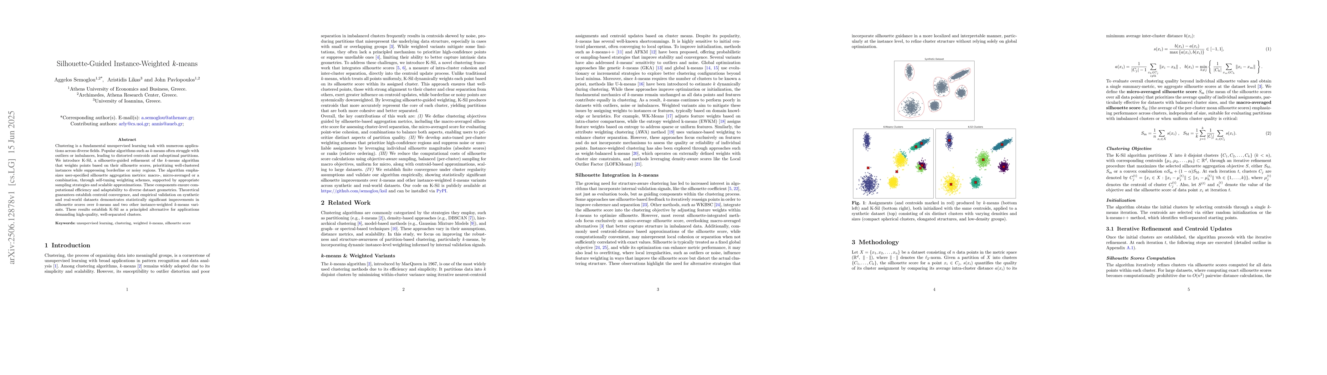 K-Sil introduces a novel silhouette-guided instance-weighting refinement of the k-means algorithm, offering theoretical guarantees for centroid convergence and empirical validation on diverse datasets.