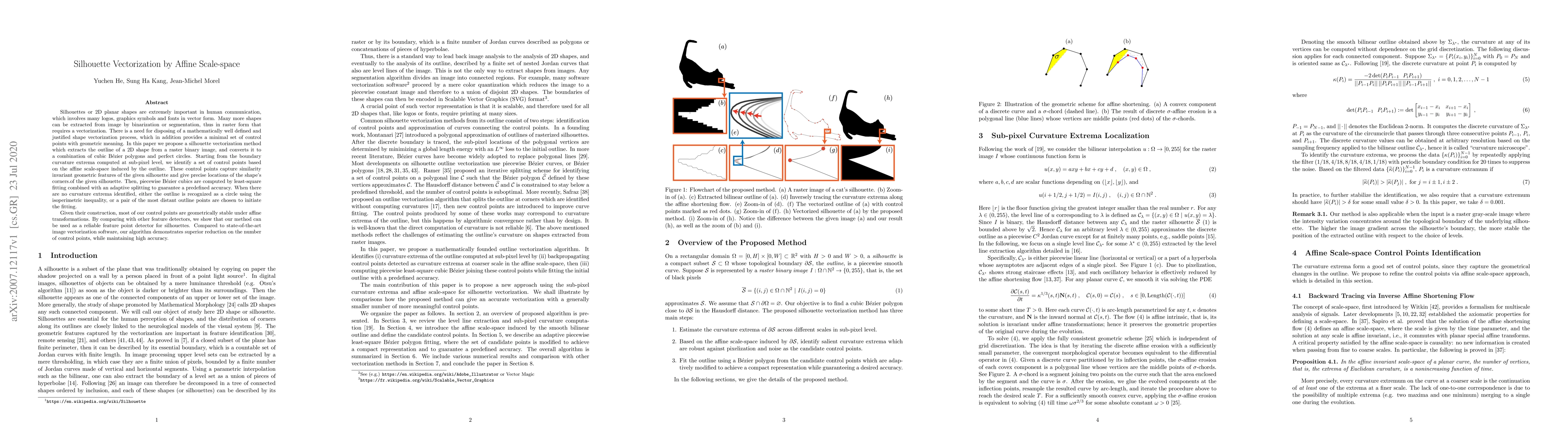 Silhouettes or 2D planar shapes are extremely important in human communication, which involves many logos, graphics symbols and fonts in vector form. Many more shapes can be extracted from image by binarization or segmentation, thus in raster form that requires a vectorization. There is a need for disposing of a mathematically well defined and justified shape vectorization process, which in addition provides a minimal set of control points with geometric meaning. In this paper we propose a silhouette vectorization method which extracts the outline of a 2D shape from a raster binary image, and converts it to a combination of cubic B\'{e}zier polygons and perfect circles. Starting from the boundary curvature extrema computed at sub-pixel level, we identify a set of control points based on the affine scale-space induced by the outline. These control points capture similarity invariant geometric features of the given silhouette and give precise locations of the shape's corners.of the given silhouette. Then, piecewise B\'{e}zier cubics are computed by least-square fitting combined with an adaptive splitting to guarantee a predefined accuracy. When there are no curvature extrema identified, either the outline is recognized as a circle using the isoperimetric inequality, or a pair of the most distant outline points are chosen to initiate the fitting. Given their construction, most of our control points are geometrically stable under affine transformations. By comparing with other feature detectors, we show that our method can be used as a reliable feature point detector for silhouettes. Compared to state-of-the-art image vectorization software, our algorithm demonstrates superior reduction on the number of control points, while maintaining high accuracy.