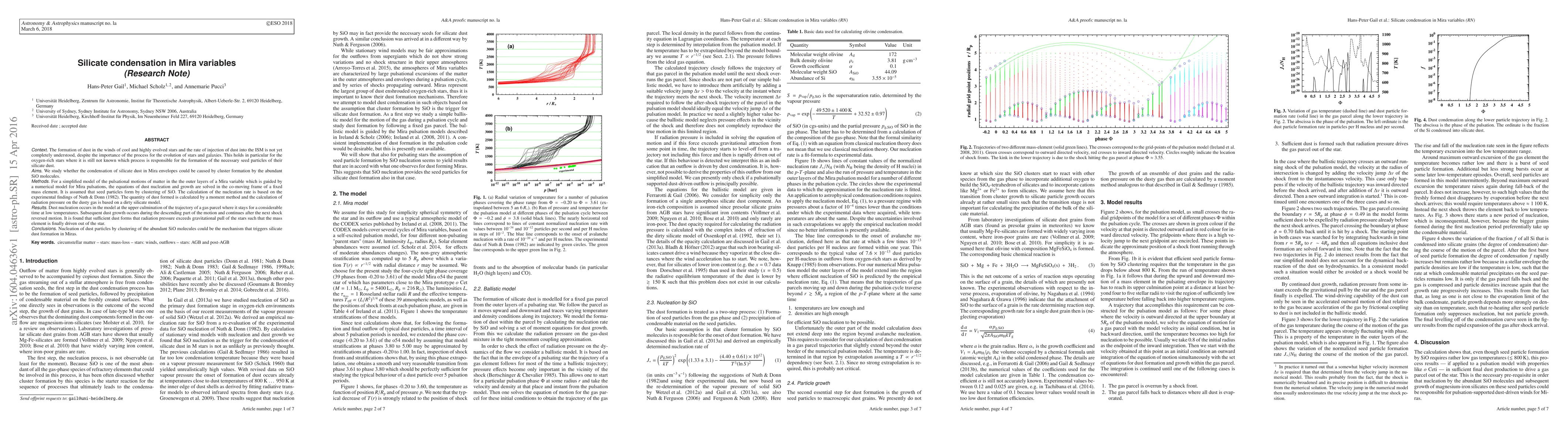 This paper investigates the formation of silicate dust in Mira variable stars through the clustering of SiO molecules, finding that sufficient dust forms to drive mass out of the star due to radiation pressure exceeding gravitational pull. The study uses a simplified model of Mira pulsations and dust nucleation based on experimental data.
