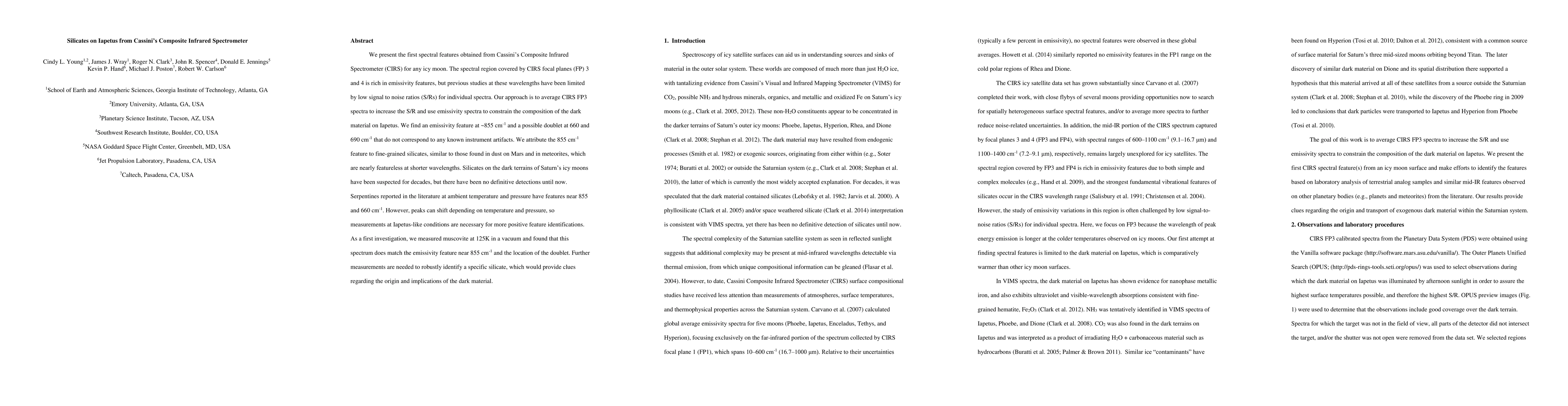 This study identifies spectral features from Cassini's CIRS indicating the presence of fine-grained silicates on Iapetus' dark terrain, similar to those found in Martian dust and meteorites. Initial measurements suggest muscovite matches the observed spectral features, but further investigations under Iapetus-like conditions are required for definitive identification.