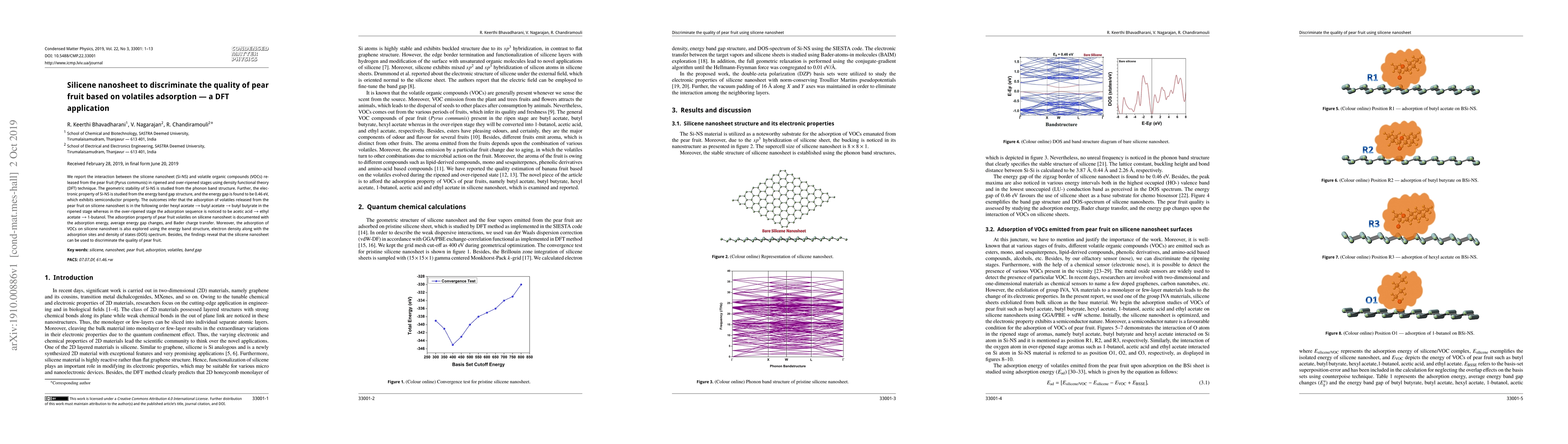 This research utilizes density functional theory (DFT) to study how silicene nanosheets interact with volatile organic compounds (VOCs) from pear fruit at different ripeness stages, revealing distinct adsorption sequences and properties. The silicene nanosheet's semiconductor nature and adsorption characteristics suggest its potential for discriminating pear fruit quality.