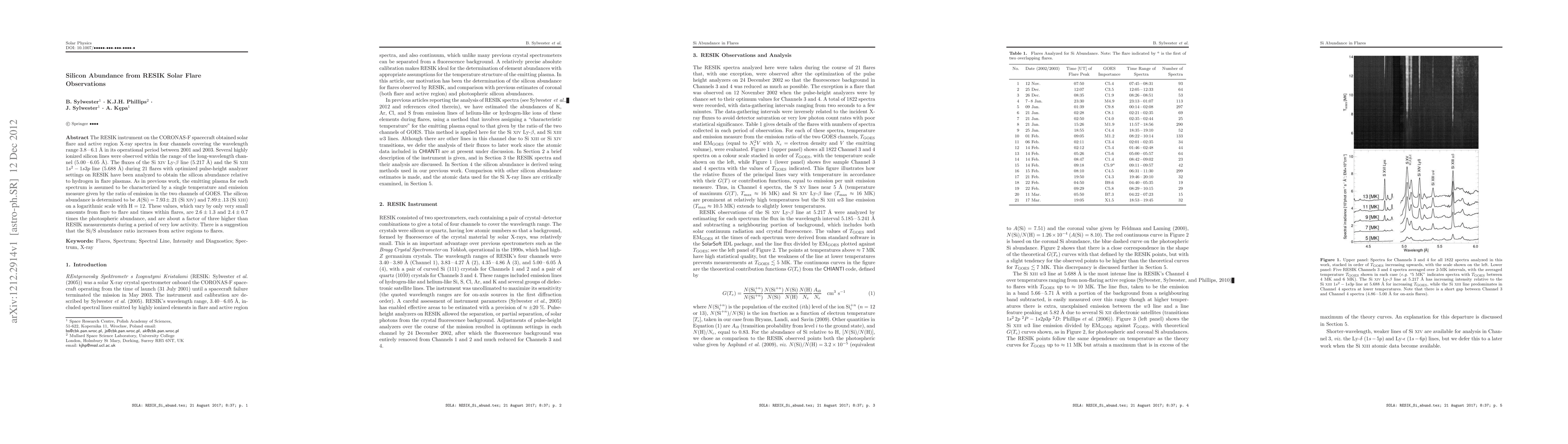 The RESIK instrument on CORONAS-F spacecraft analyzed 21 solar flares, measuring silicon abundance relative to hydrogen using sixiv Ly-$eta$ and sixiii $1s^2 - 1s3p$ lines. Silicon abundance was found to be 2.6±1.3 and 2.4±0.7 times photospheric, and about three times higher than low-activity periods. The Si/S ratio may increase from active regions to flares.
