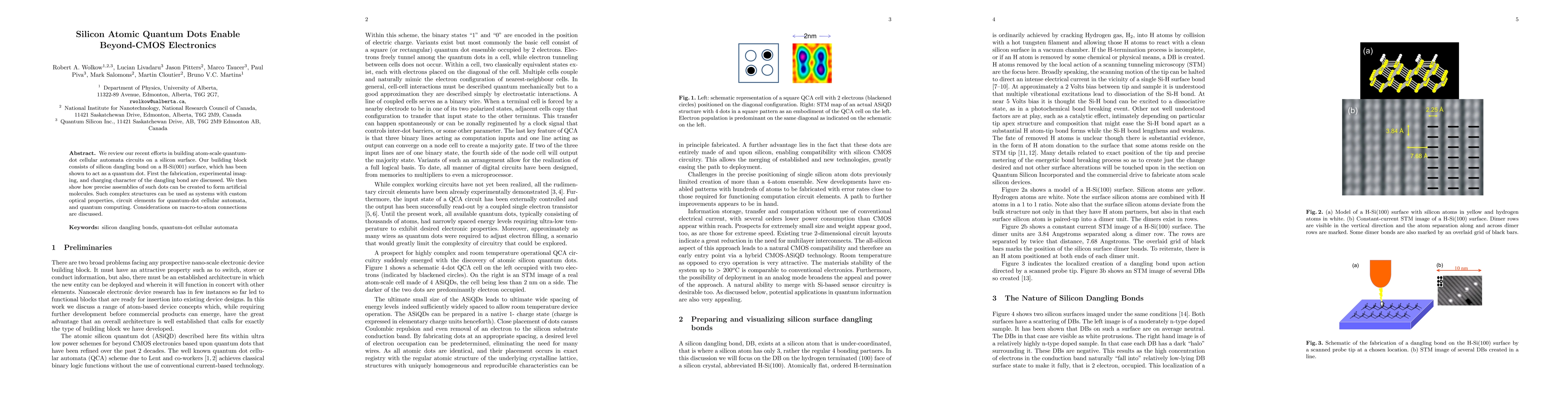We review our recent efforts in building atom-scale quantum-dot cellular automata circuits on a silicon surface. Our building block consists of silicon dangling bond on a H-Si(001) surface, which has been shown to act as a quantum dot. First the fabrication, experimental imaging, and charging character of the dangling bond are discussed. We then show how precise assemblies of such dots can be created to form artificial molecules. Such complex structures can be used as systems with custom optical properties, circuit elements for quantum-dot cellular automata, and quantum computing. Considerations on macro-to-atom connections are discussed.